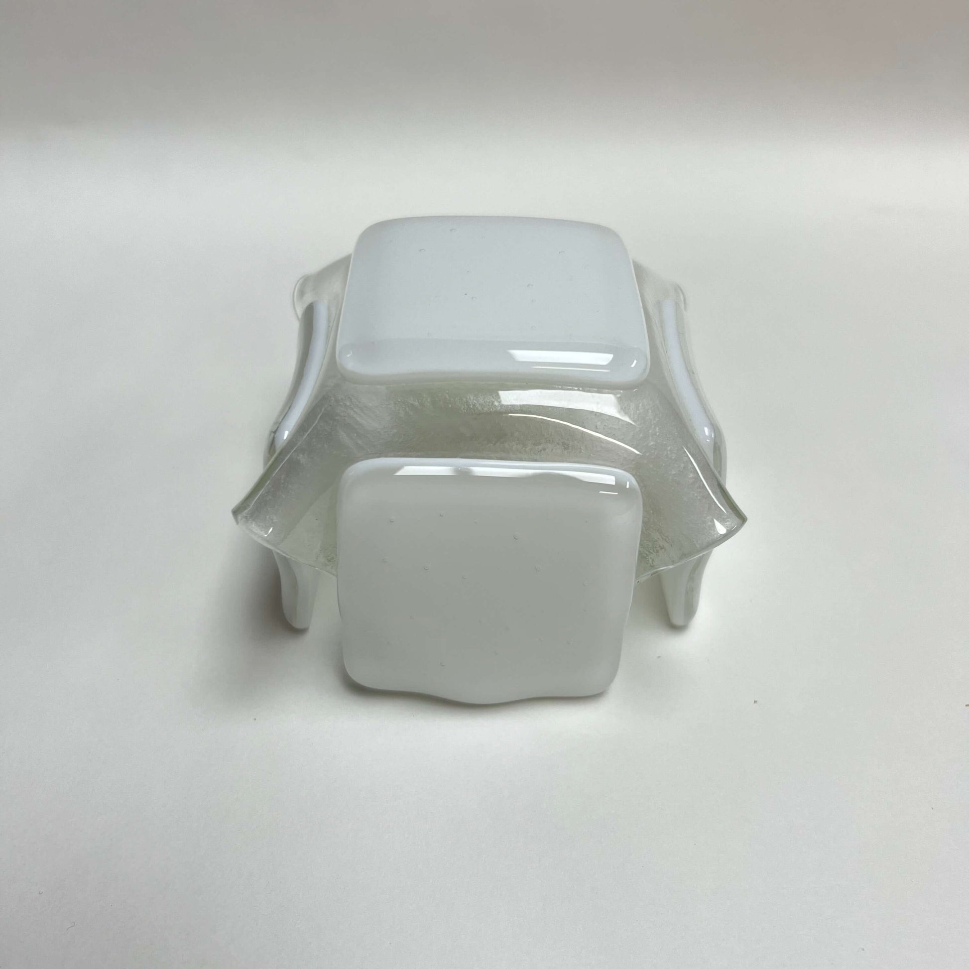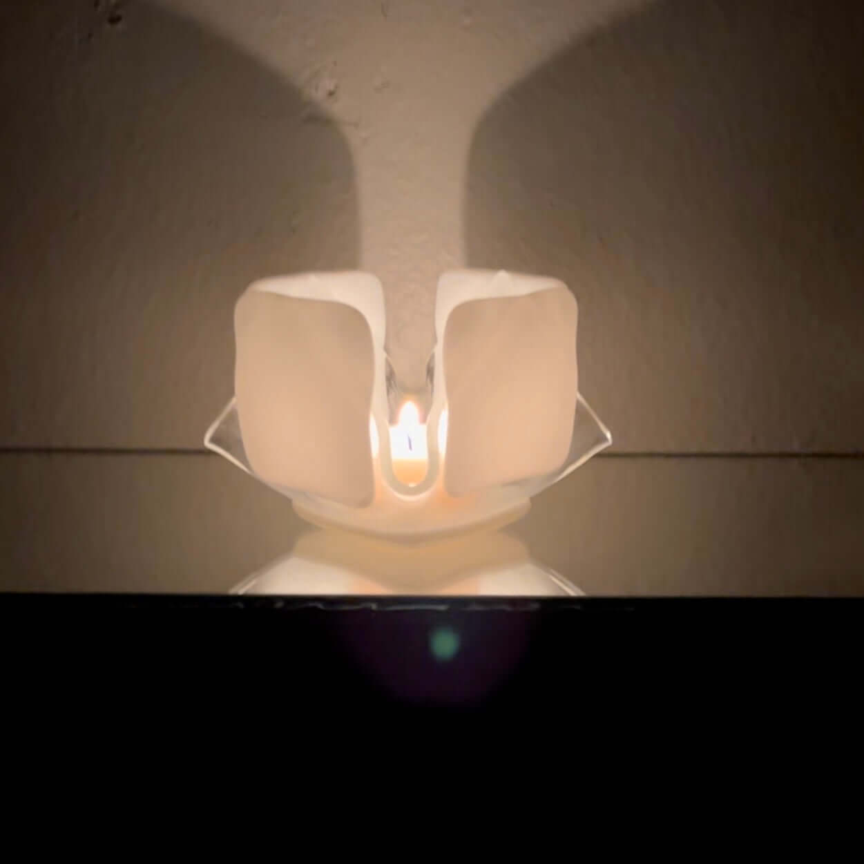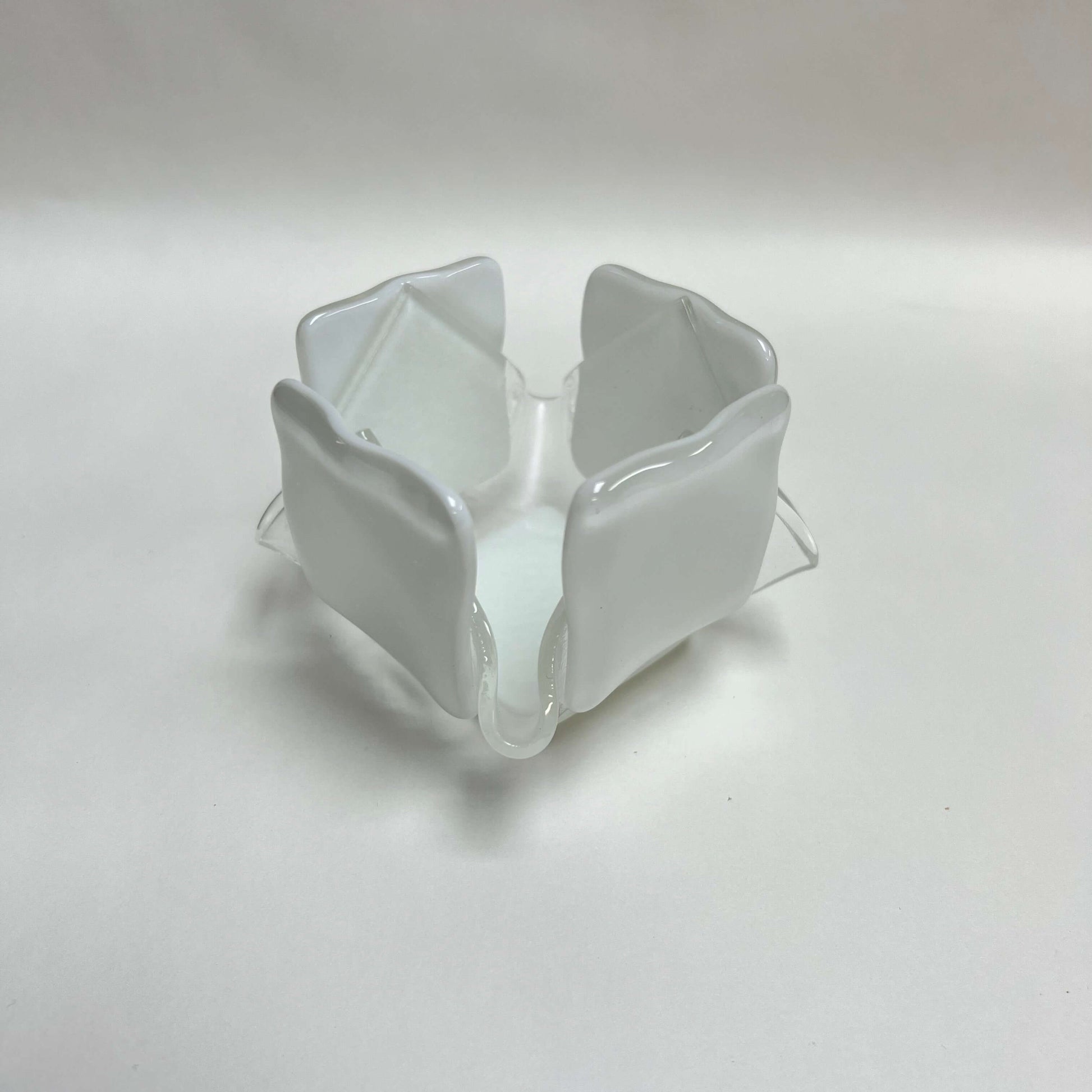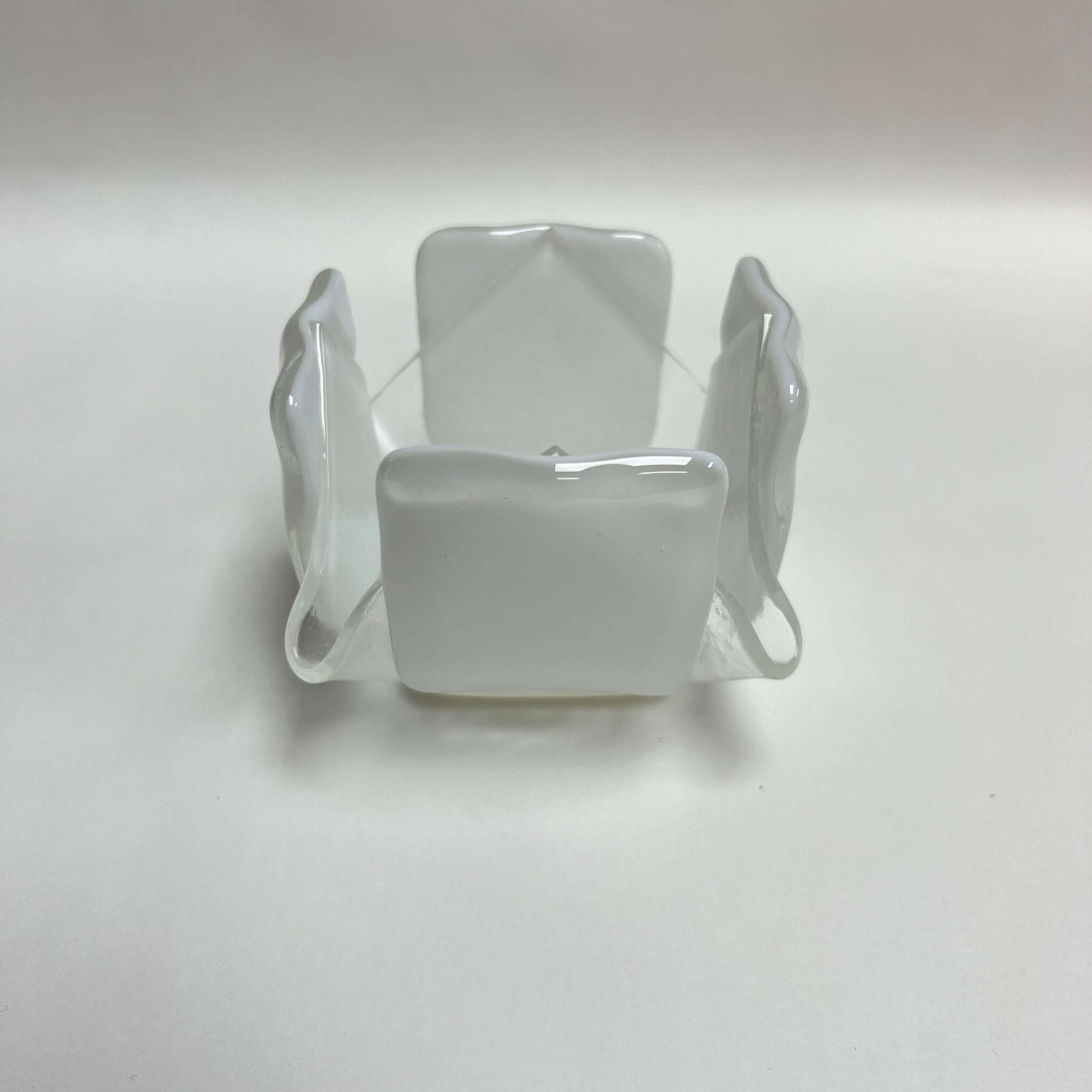 Our exclusive candleholder adorned with beautiful white opalescent glass. This exquisite piece of home decor is sure to captivate with its distinct and eye-catching design.
