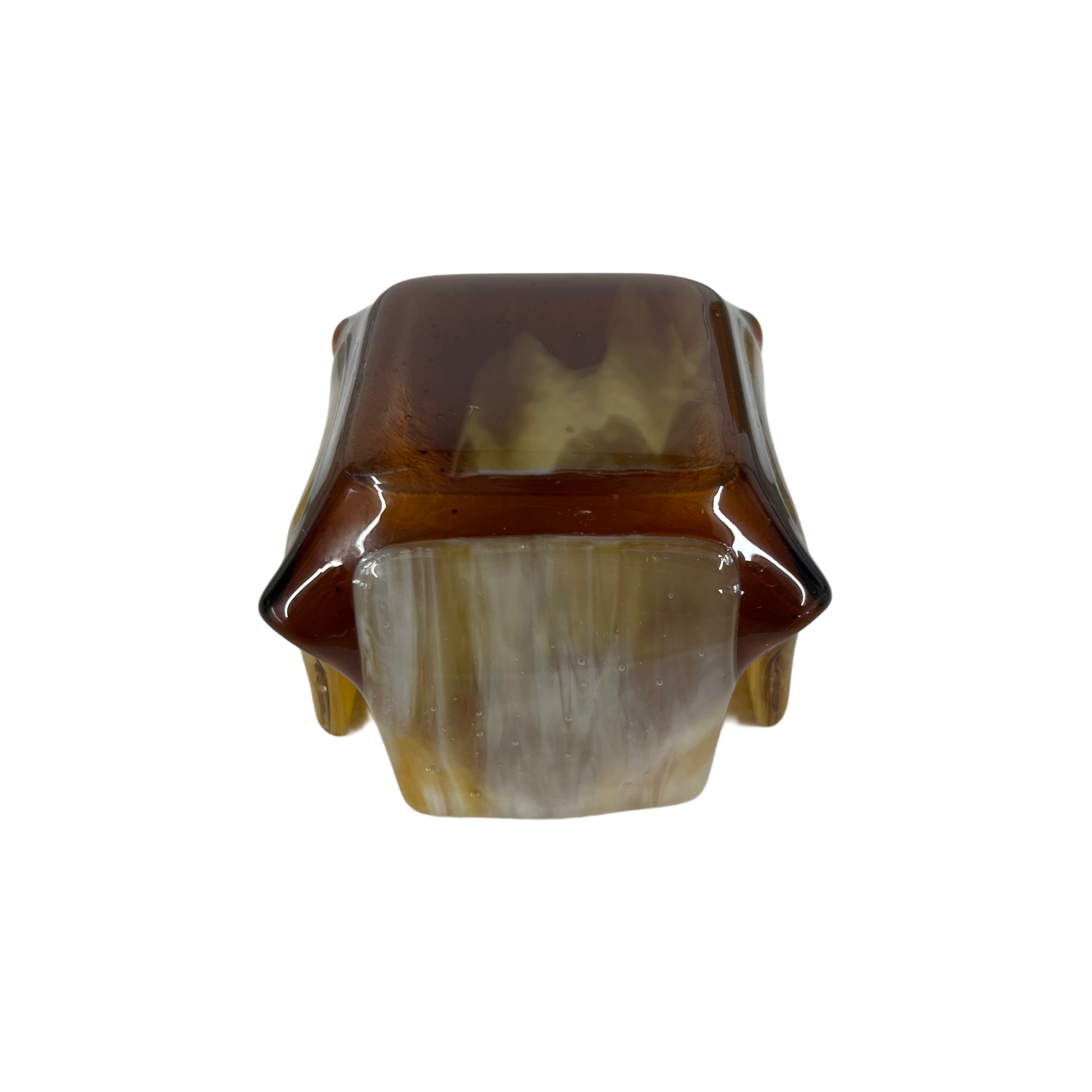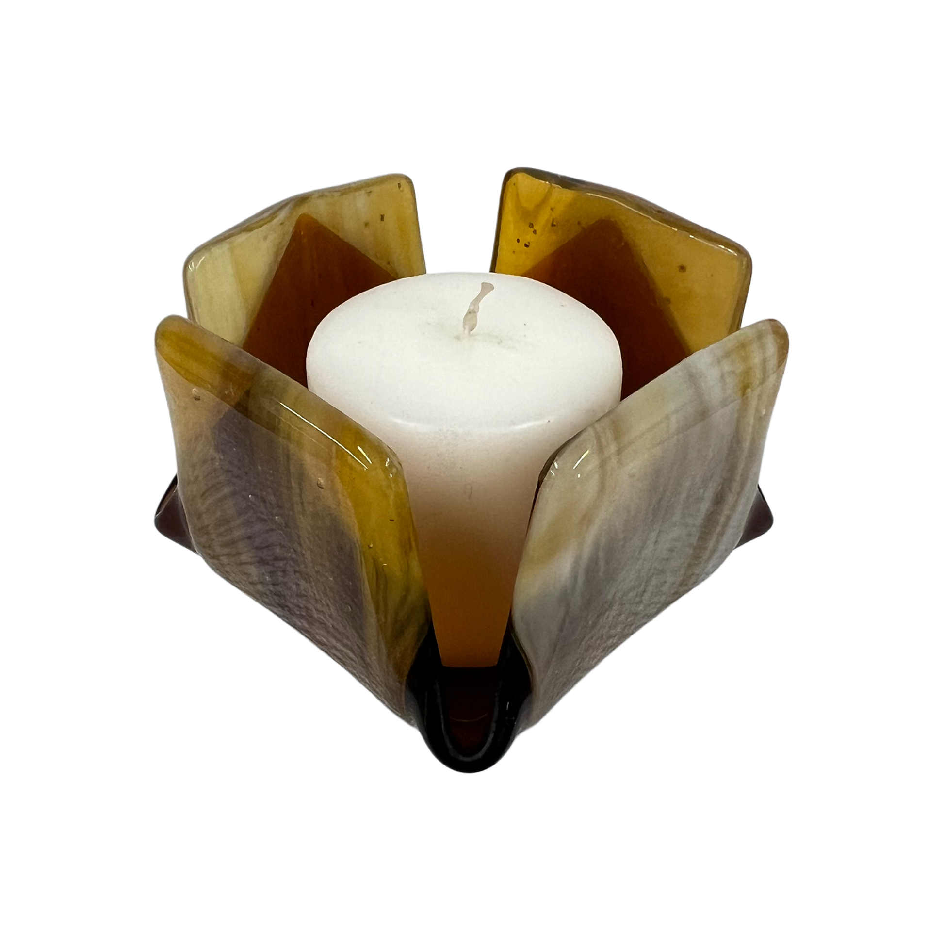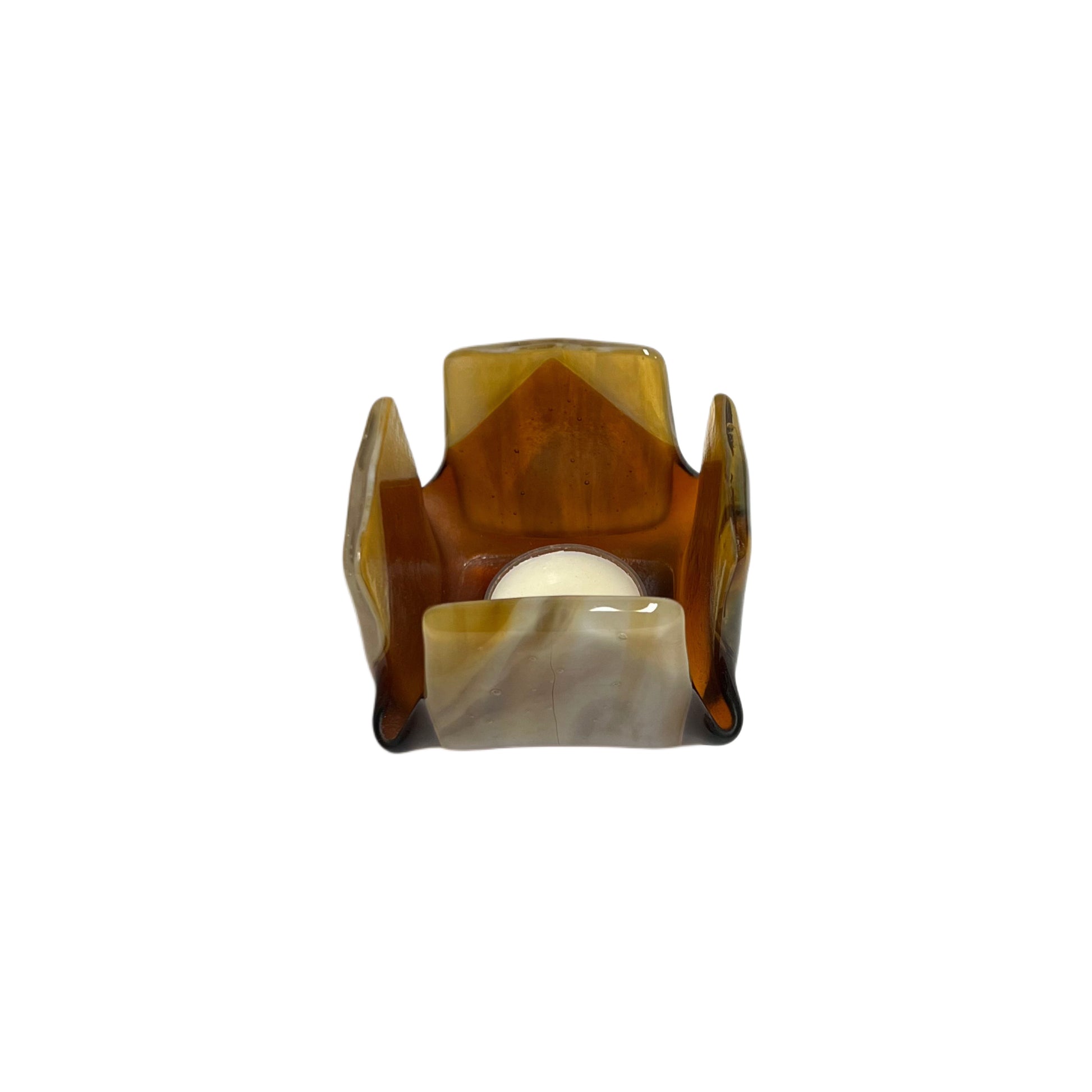 Our exclusive candleholder adorned with beautiful amber and white opalescent glass. This exquisite piece of home decor is sure to captivate with its distinct and eye-catching design.