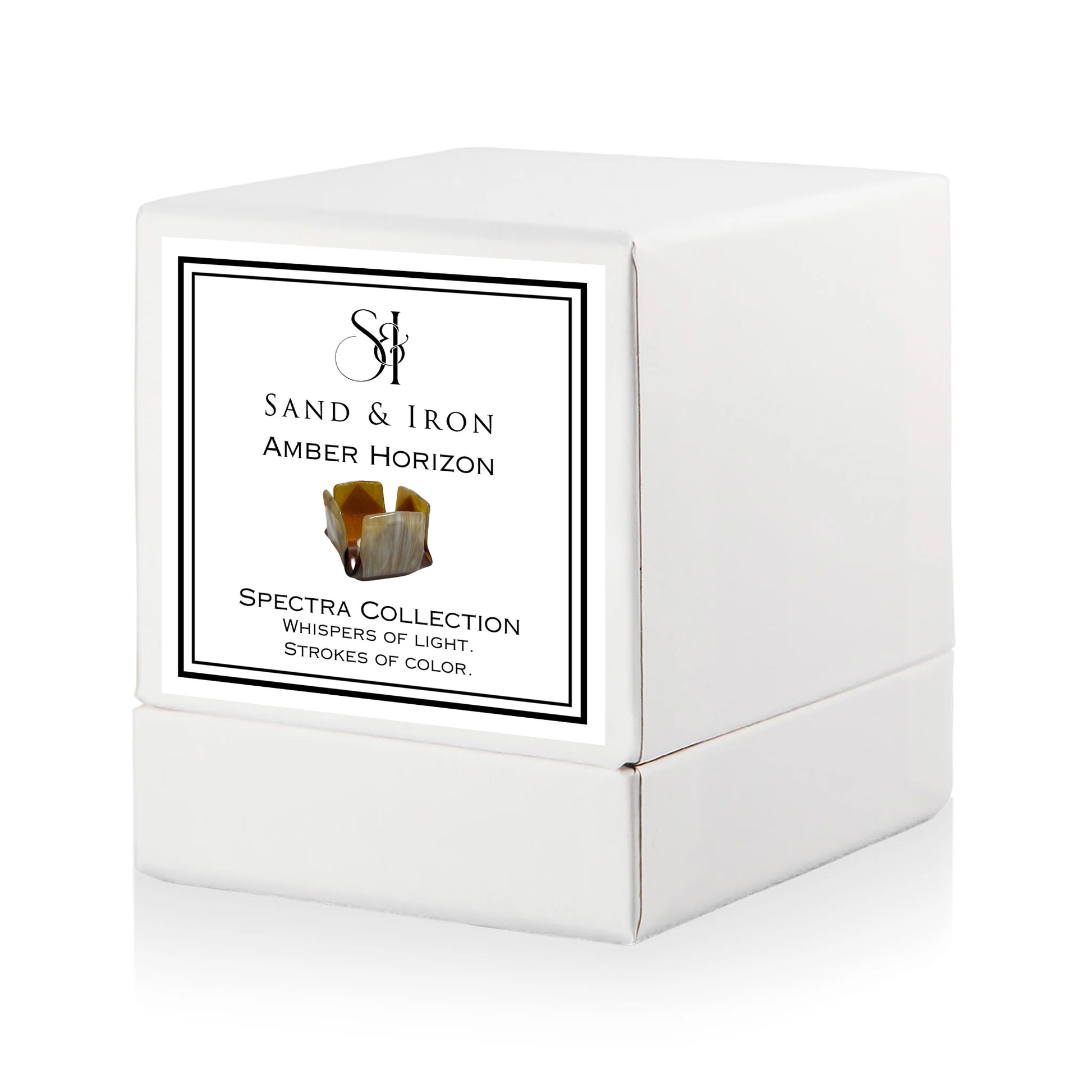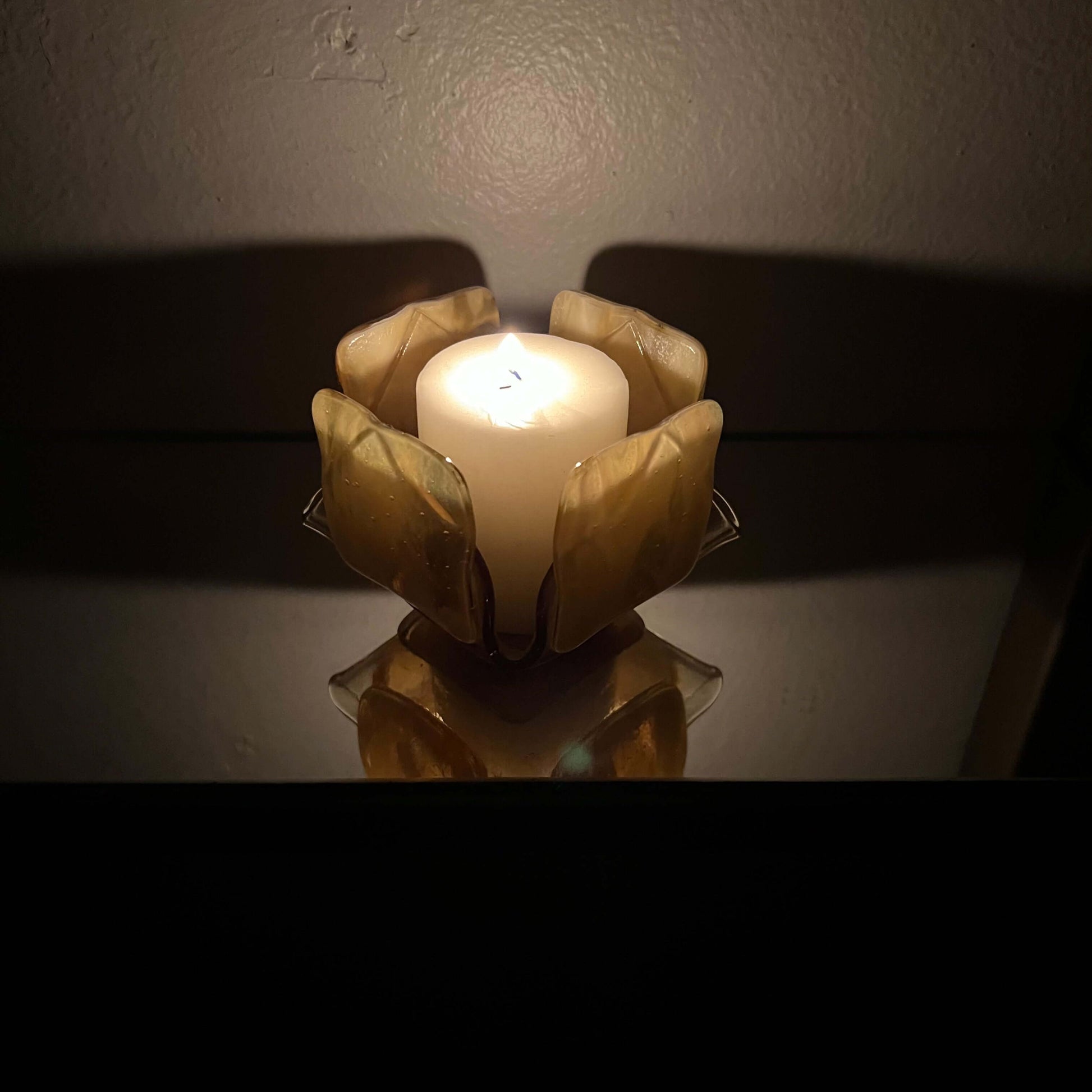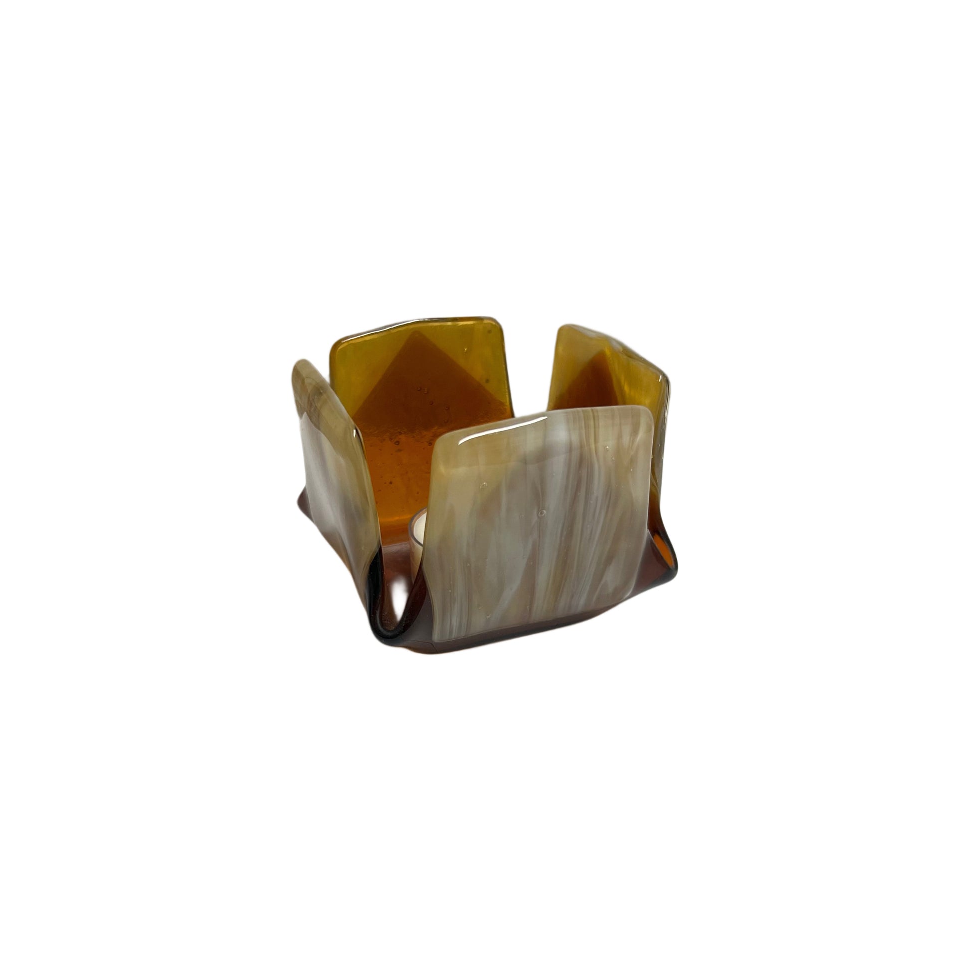 Our exclusive candleholder adorned with beautiful amber and white opalescent glass. This exquisite piece of home decor is sure to captivate with its distinct and eye-catching design.