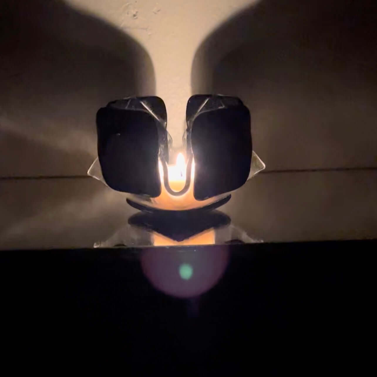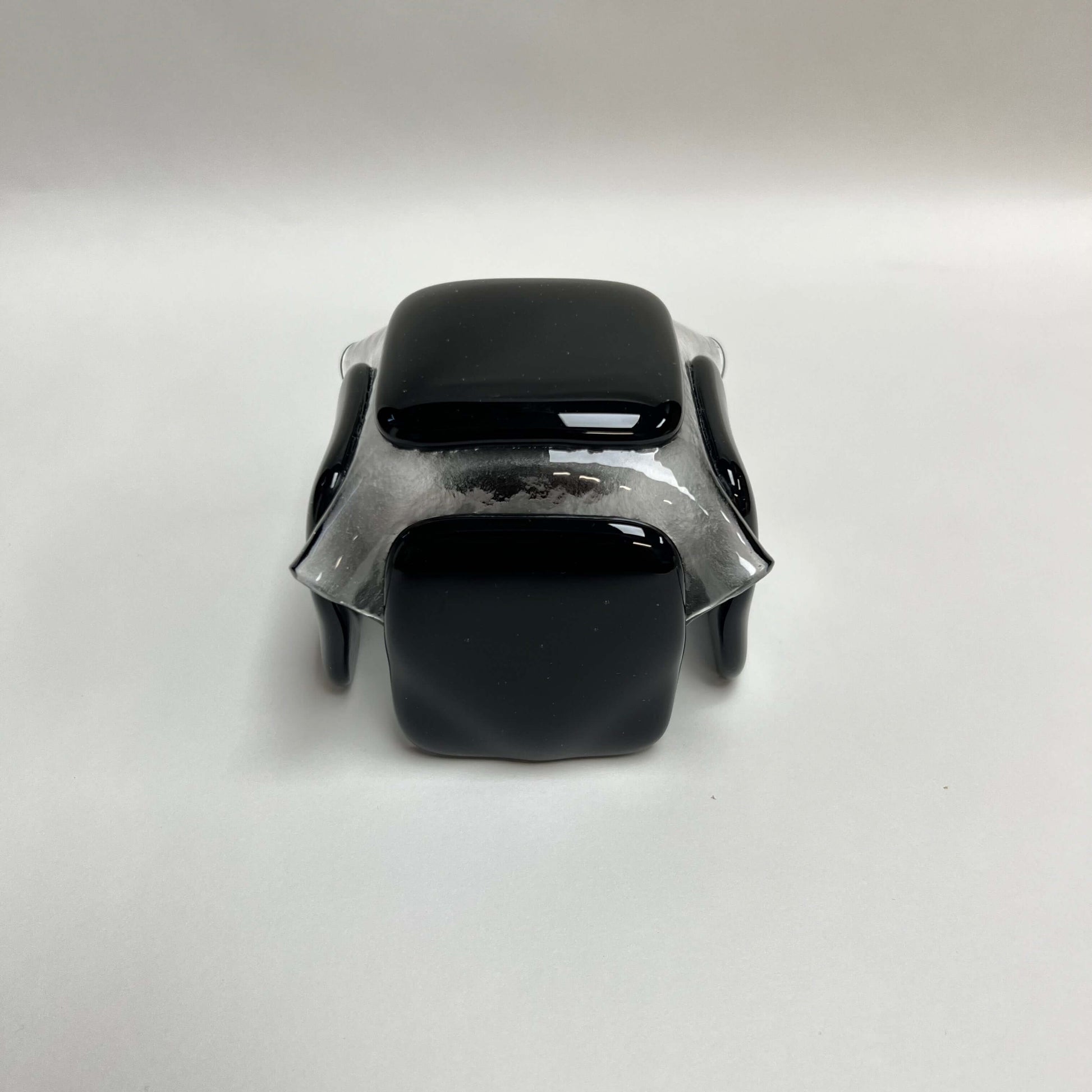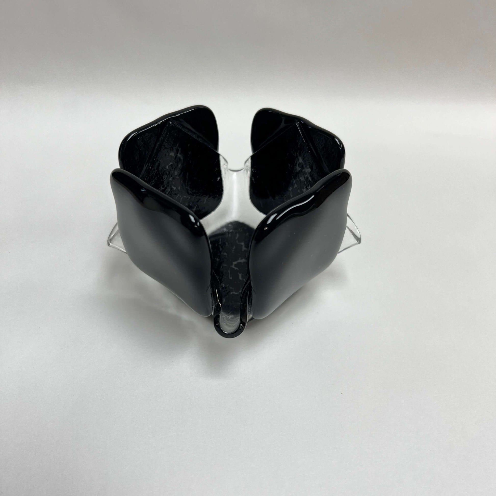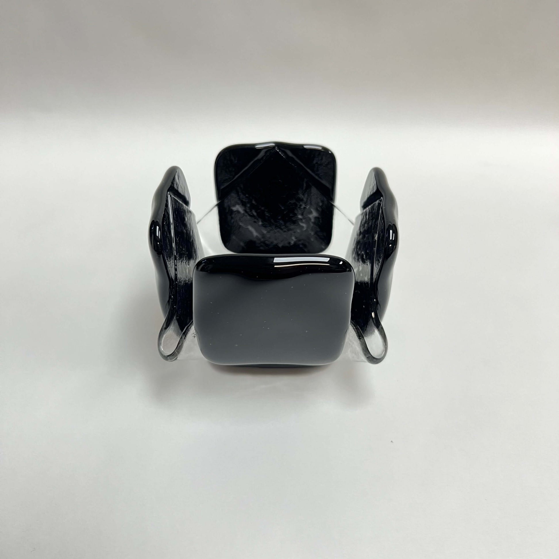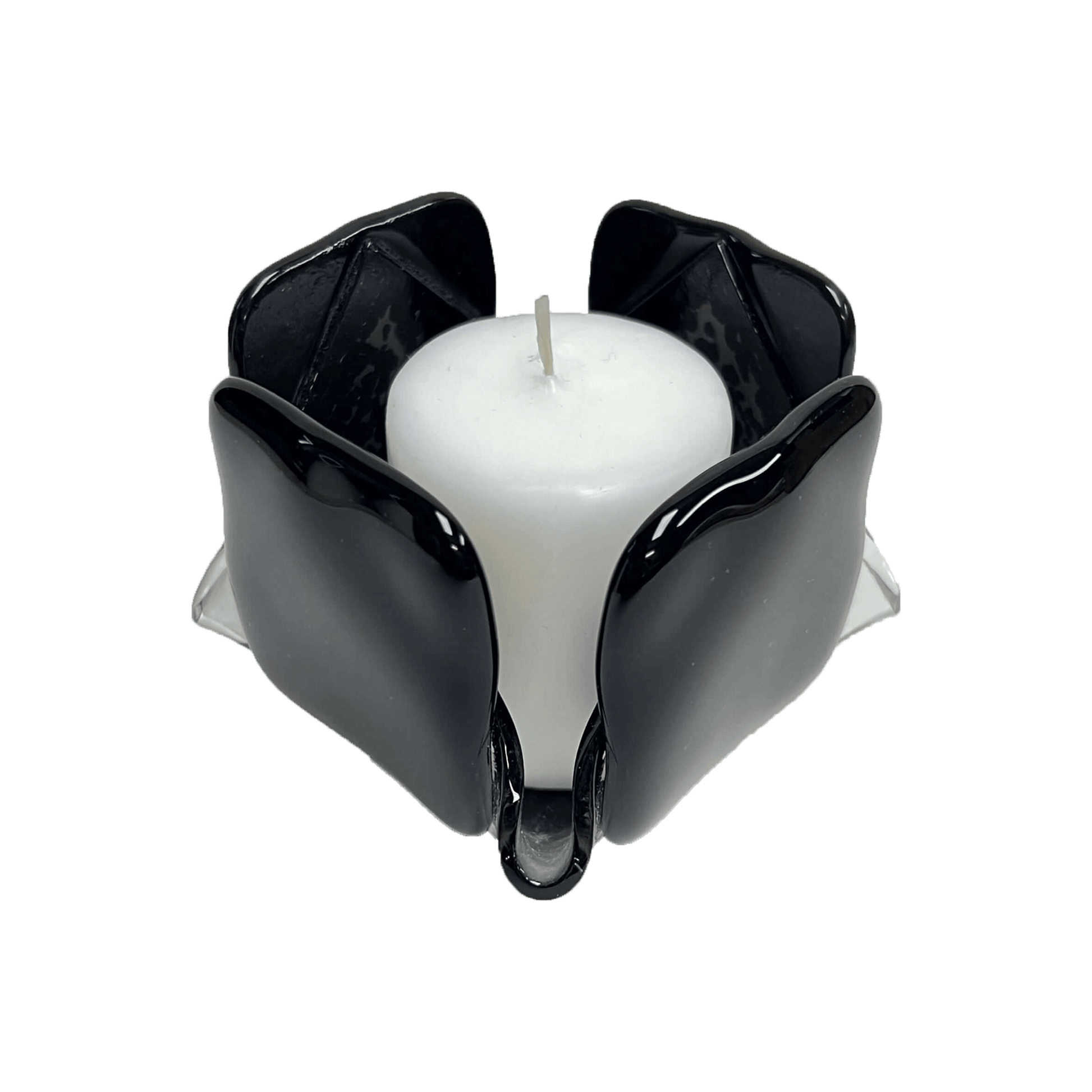 Our exclusive candleholder adorned with beautiful black opalescent glass. This exquisite piece of home decor is sure to captivate with its distinct and eye-catching design.