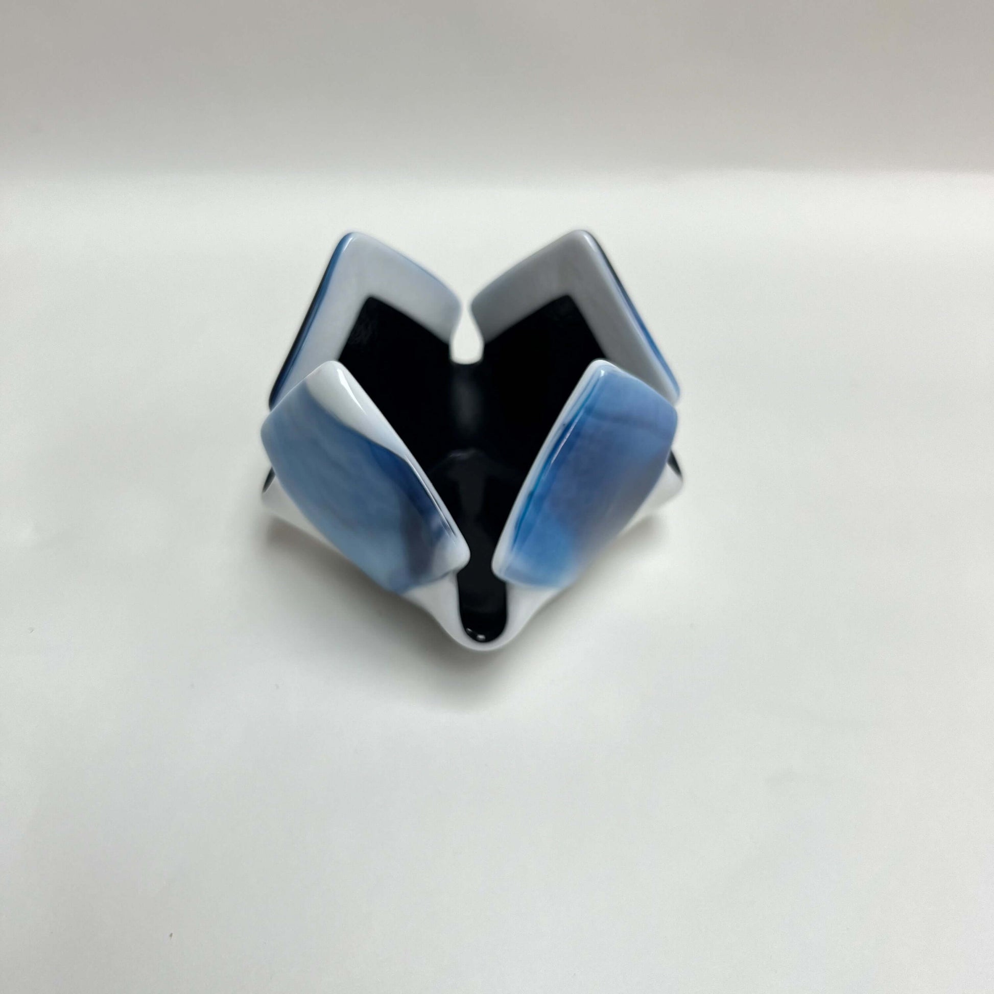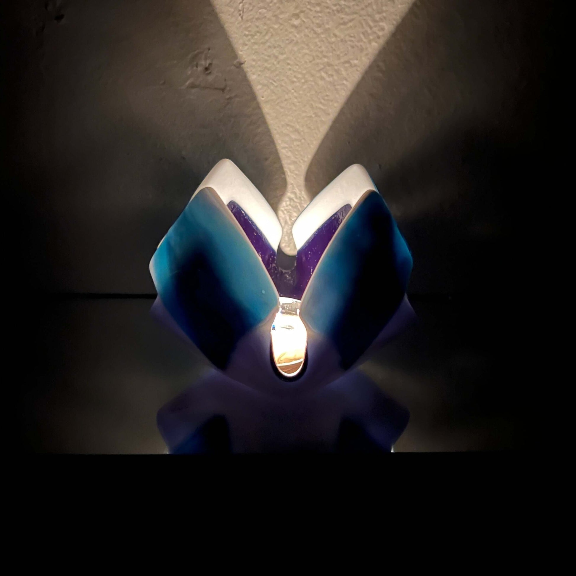 Our exclusive candleholder adorned with beautiful midnight blue, turquoise and white opalescent glass. This exquisite piece of home decor is sure to captivate with its distinct and eye-catching design.