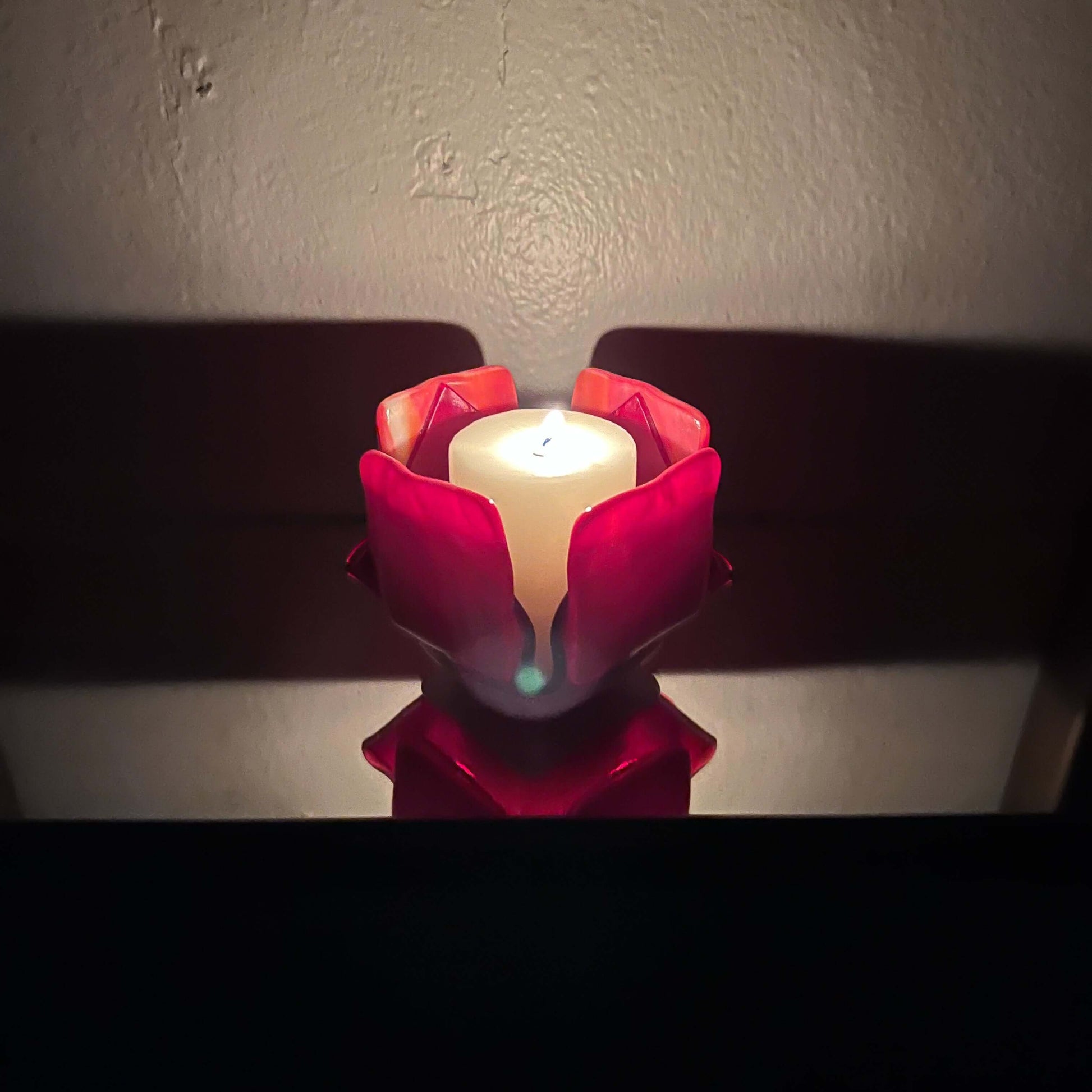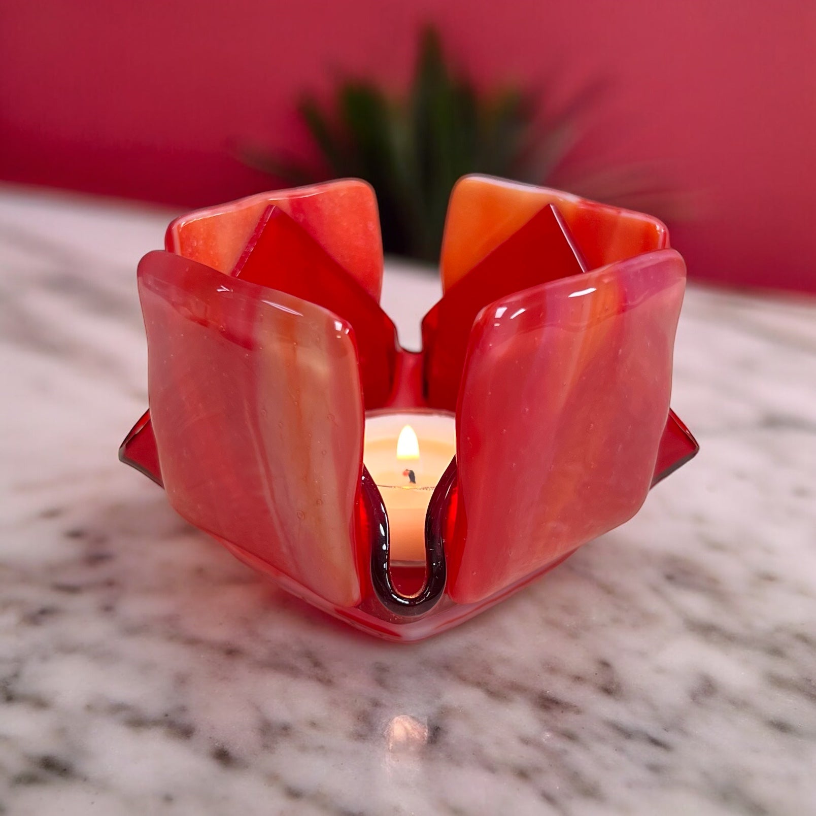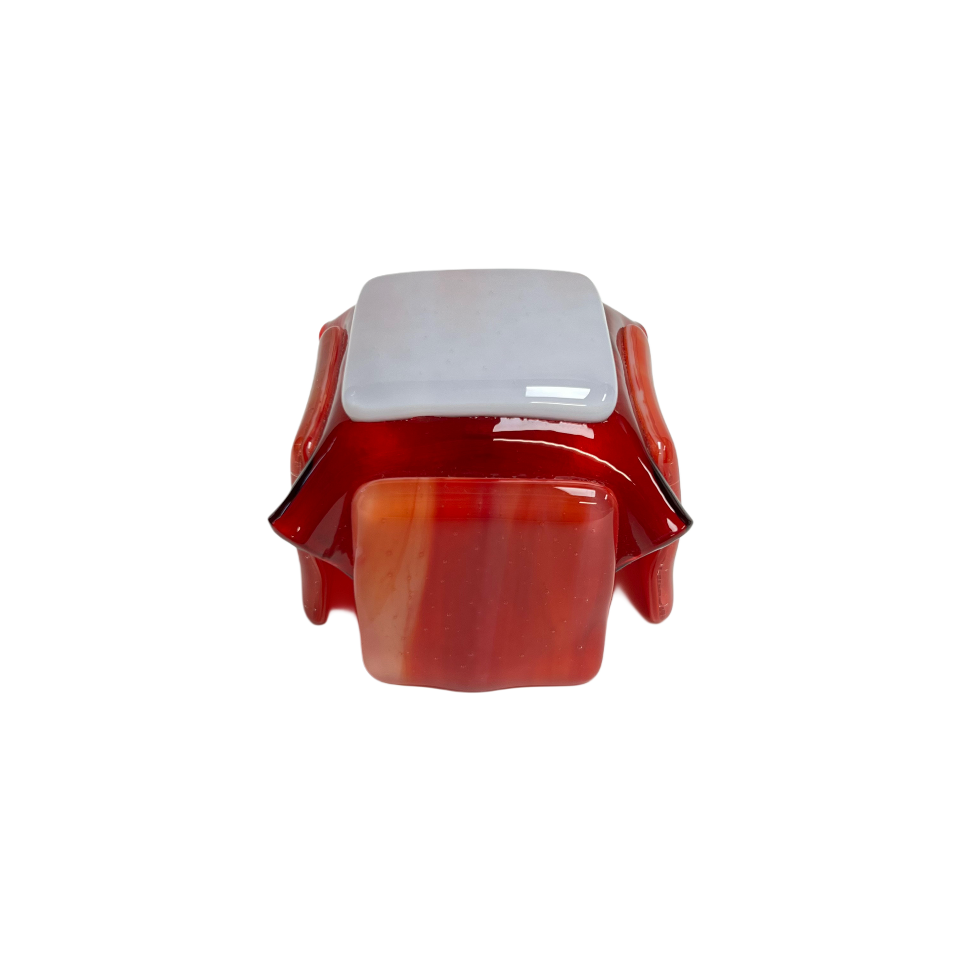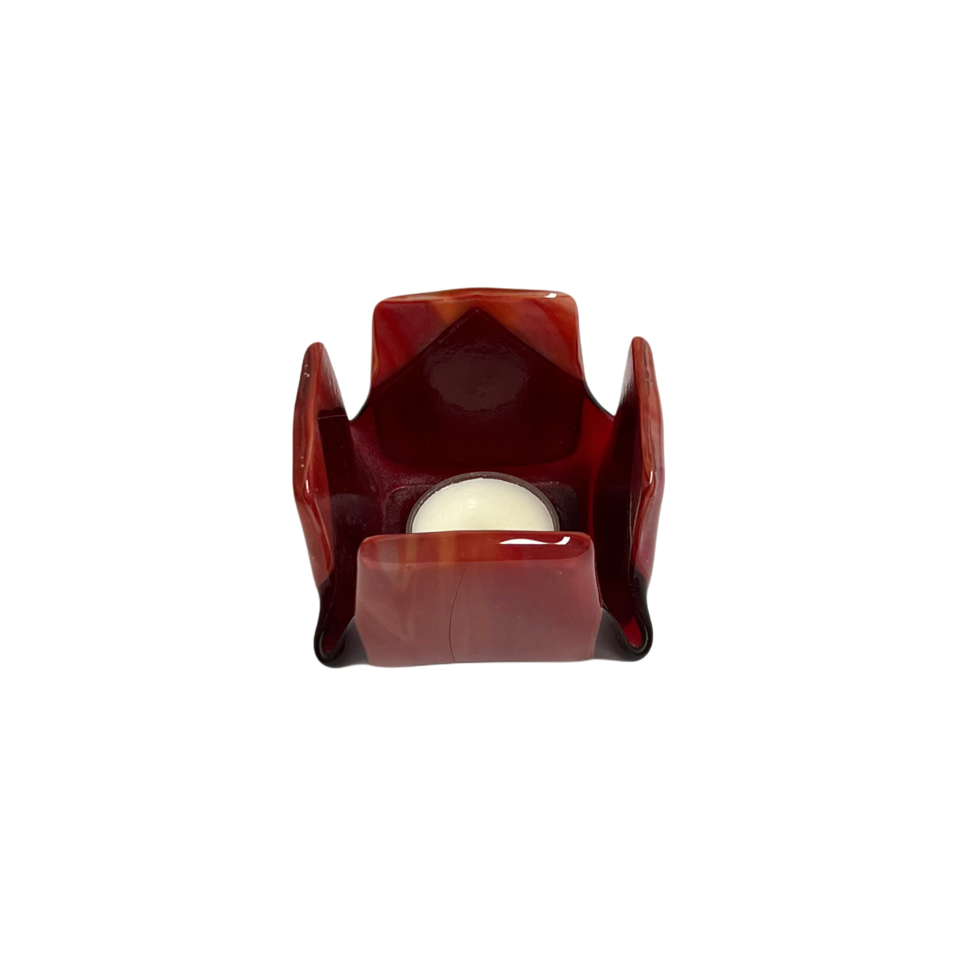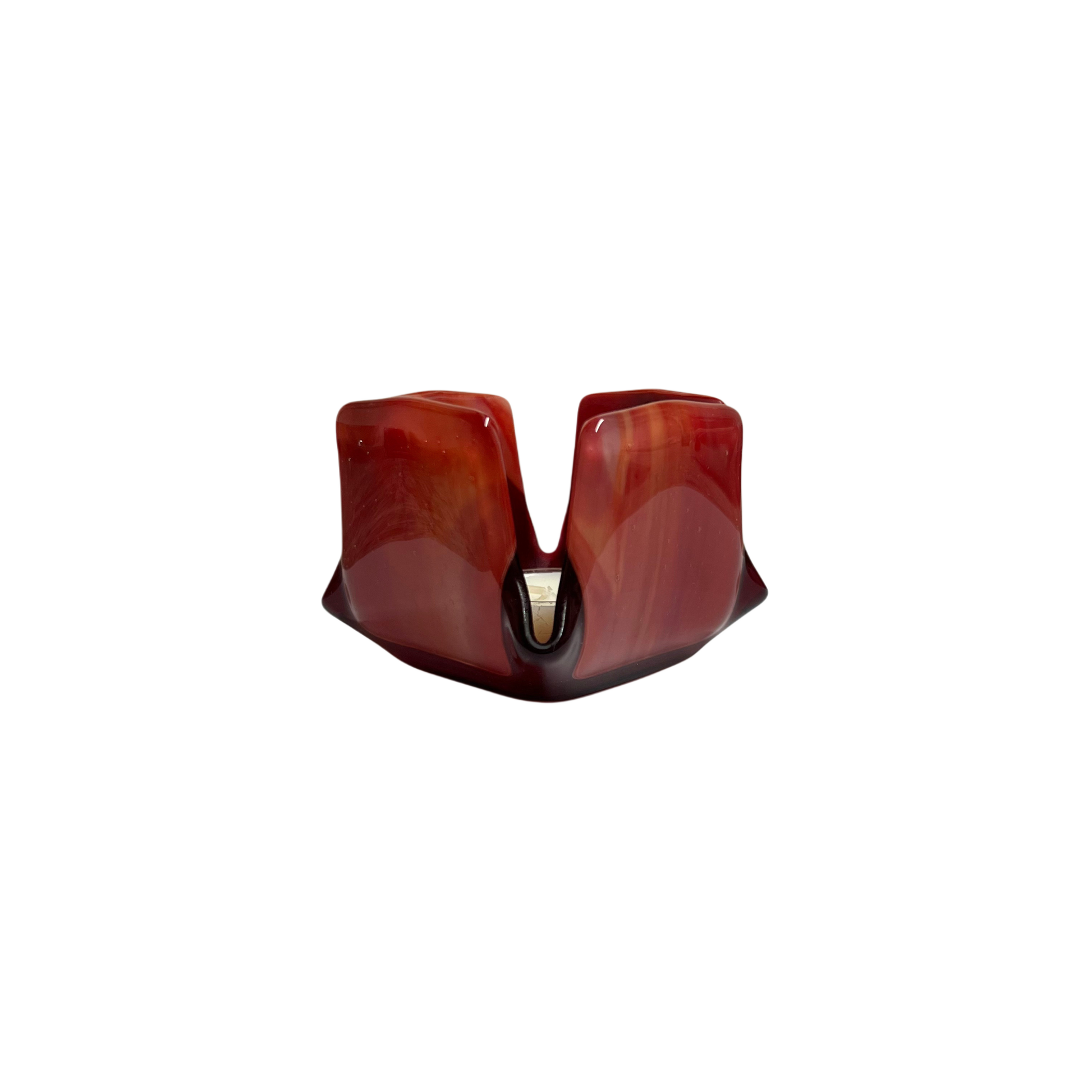Our exclusive candleholder adorned with beautiful red and white opalescent glass. This exquisite piece of home decor is sure to captivate with its distinct and eye-catching design.