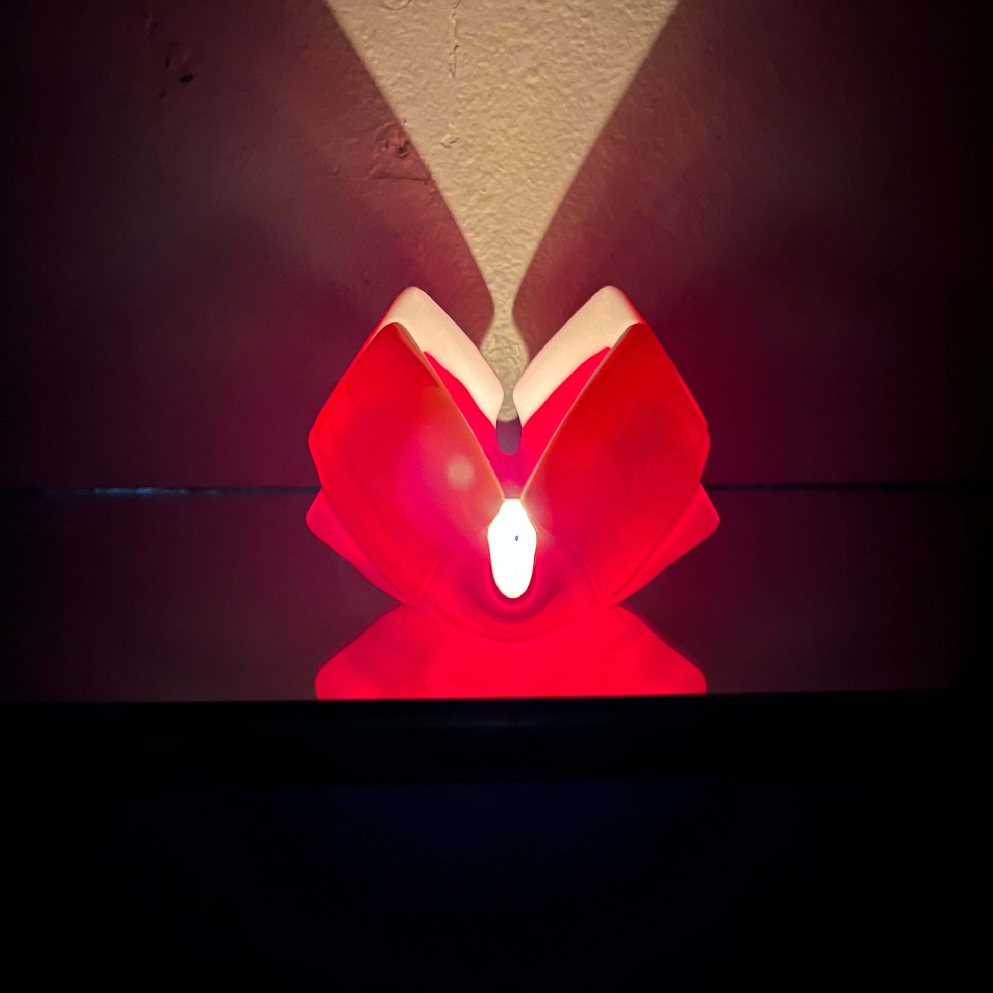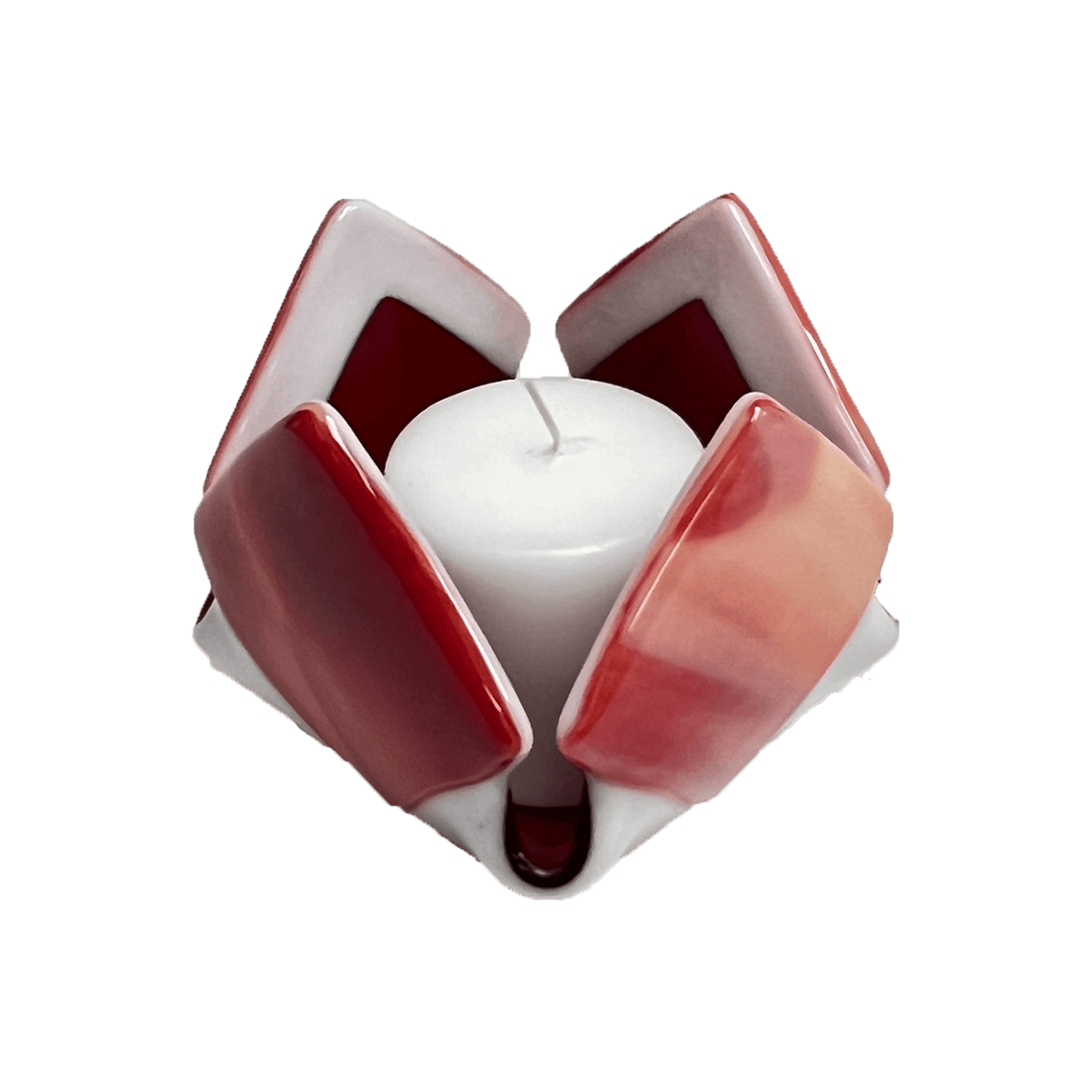 Our exclusive candleholder adorned with beautiful red and white opalescent glass. This exquisite piece of home decor is sure to captivate with its distinct and eye-catching design.