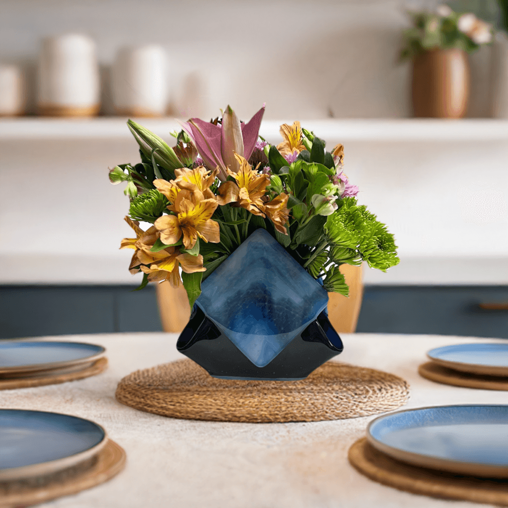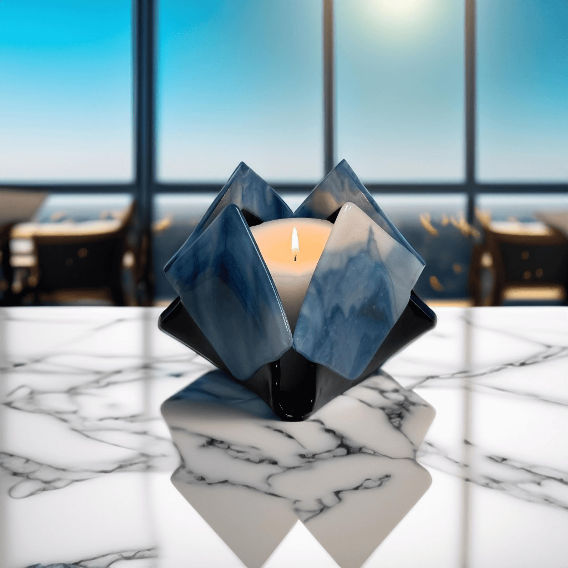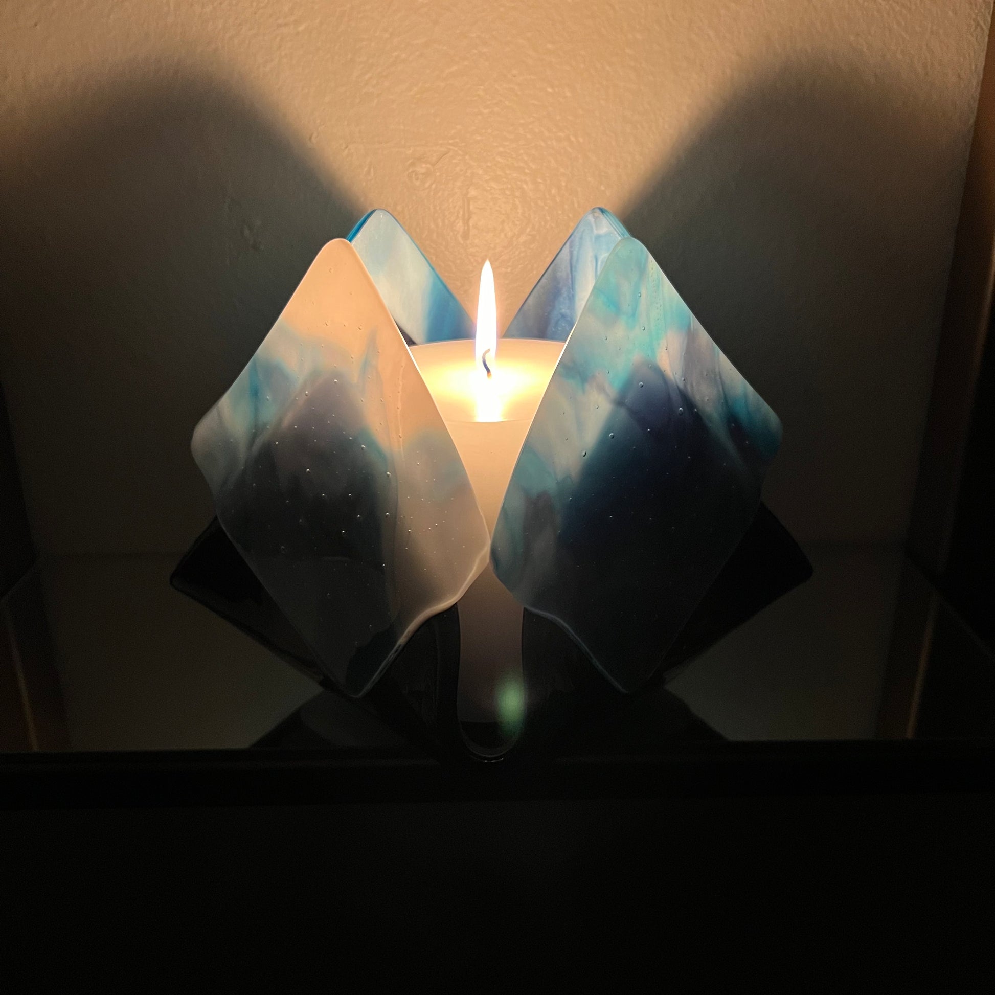 Our exclusive home accessory with a mix of blues and white opalescent glass. This exquisite piece of home decor is sure to captivate with its distinct and eye-catching design.