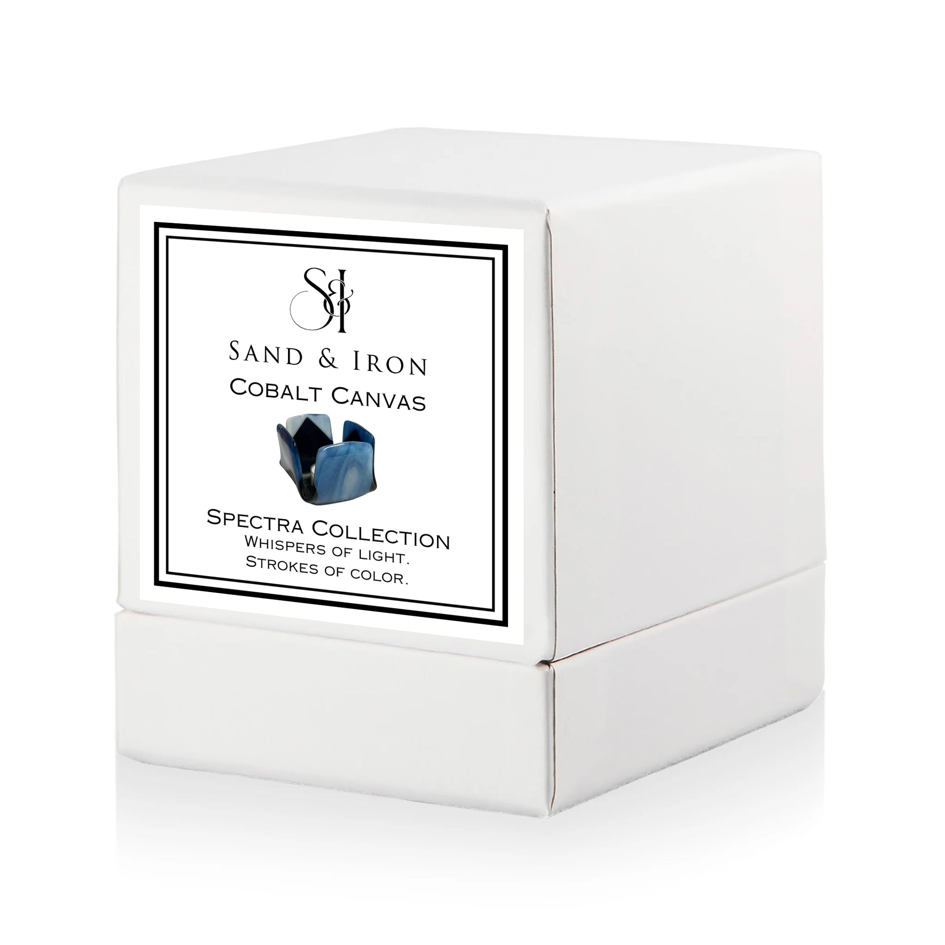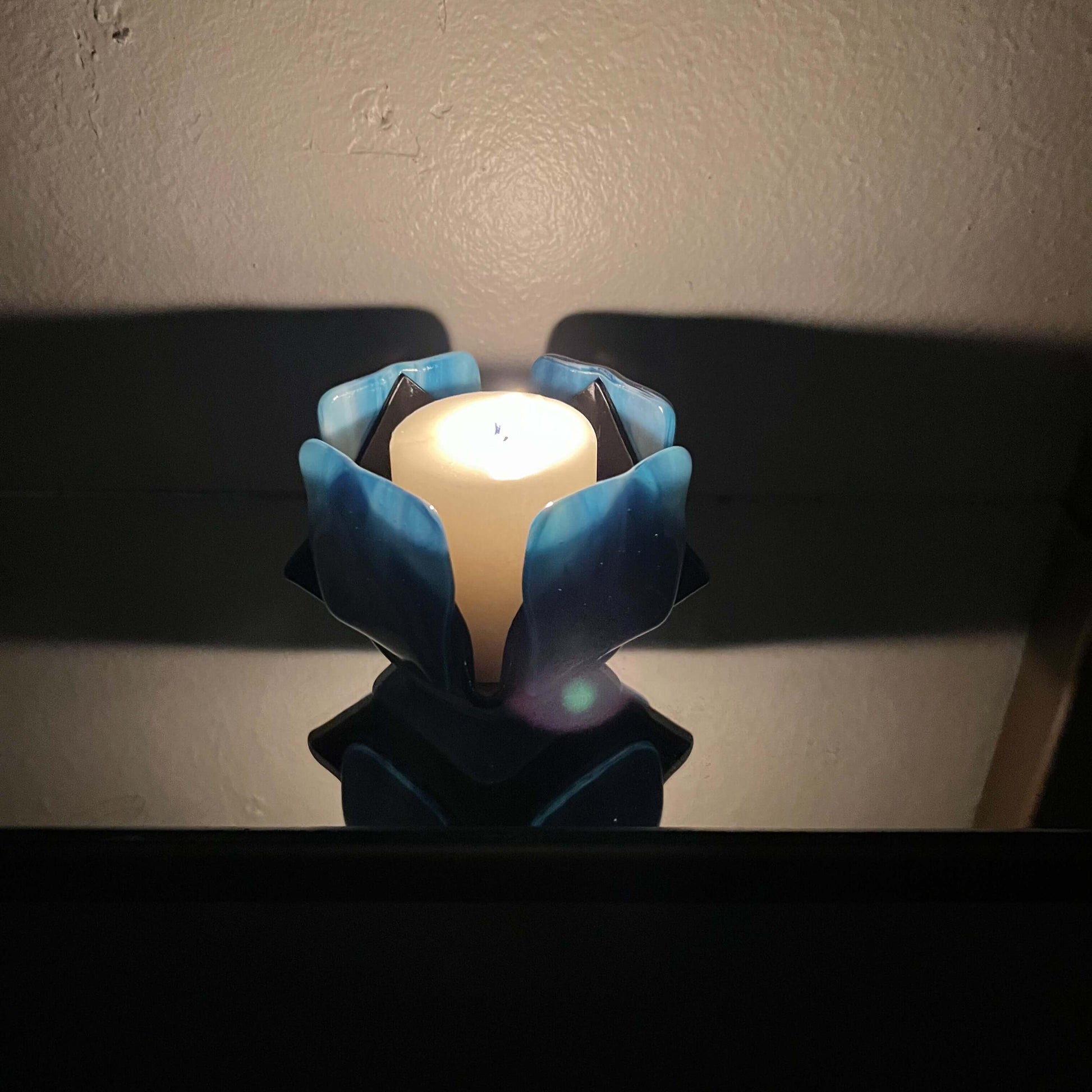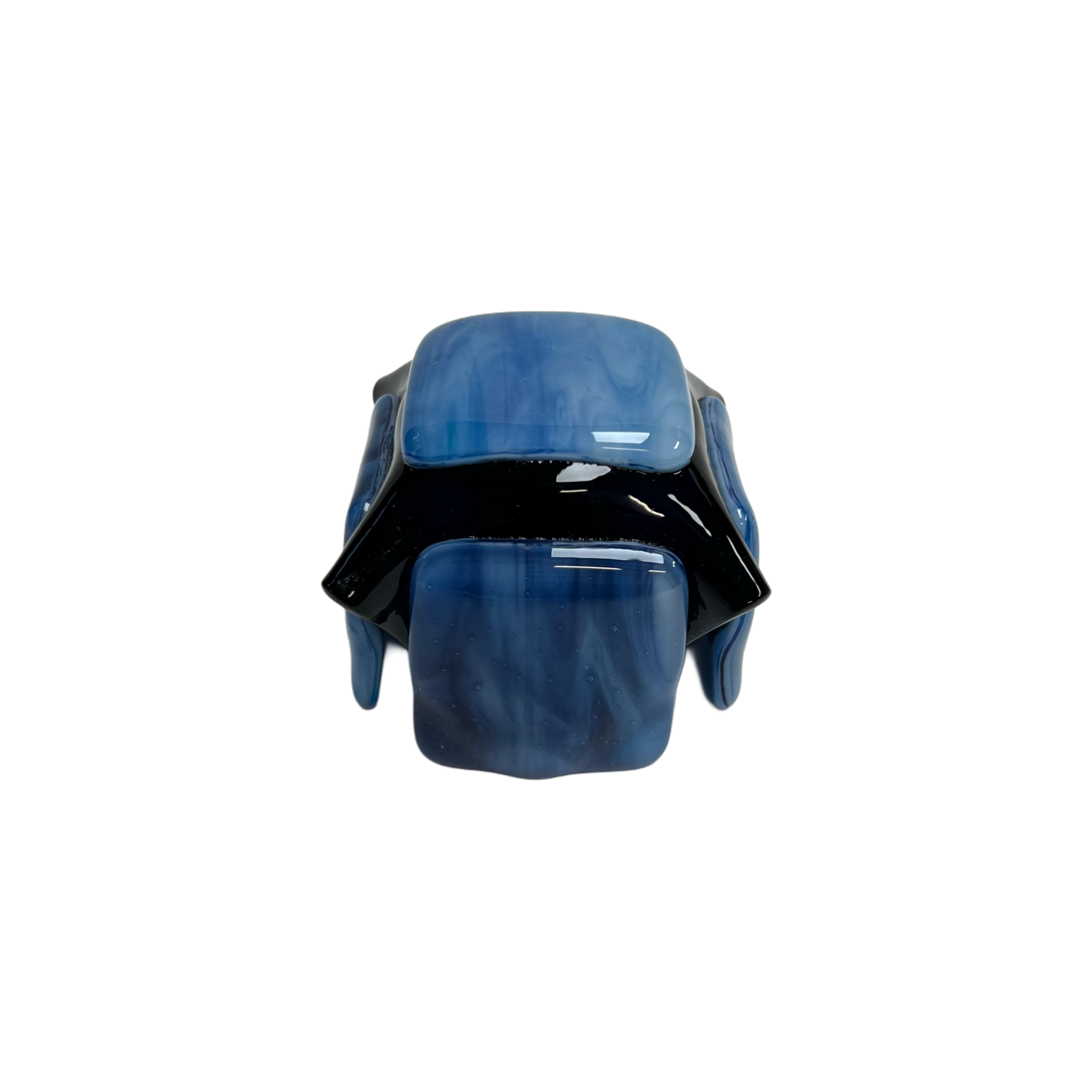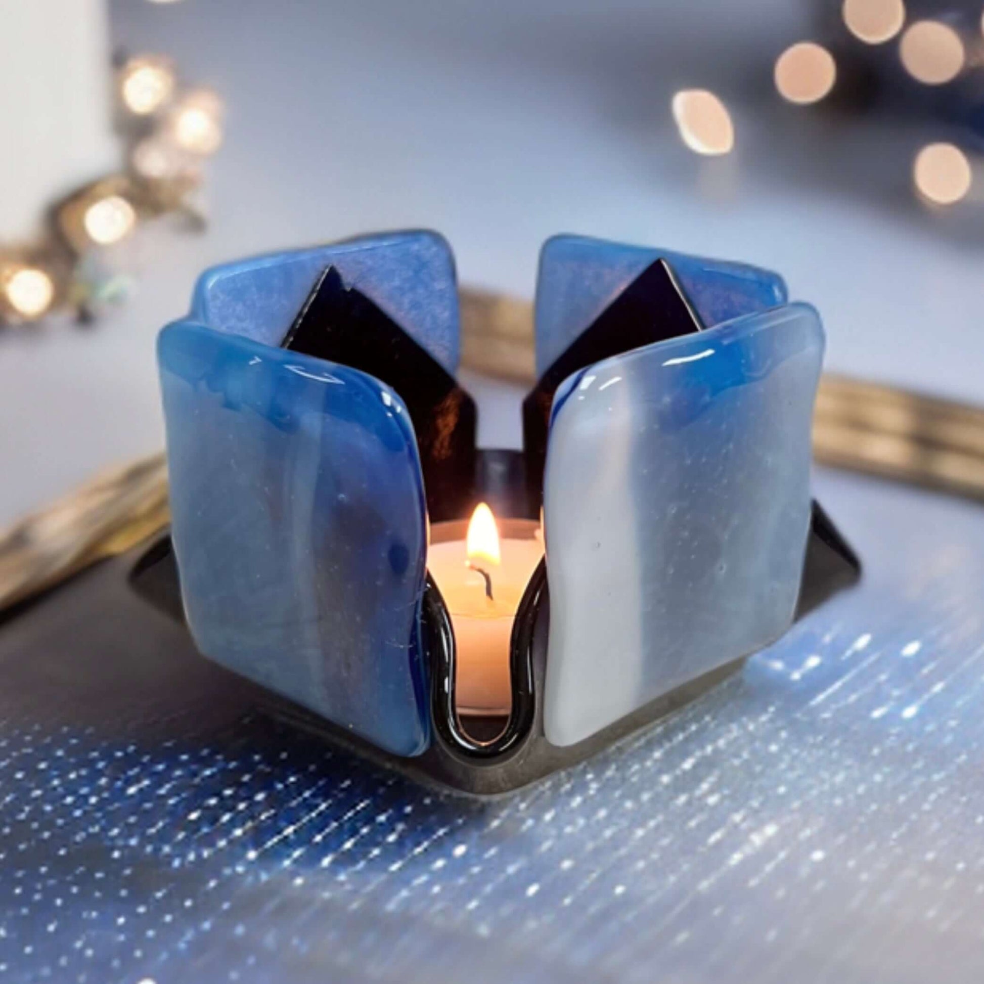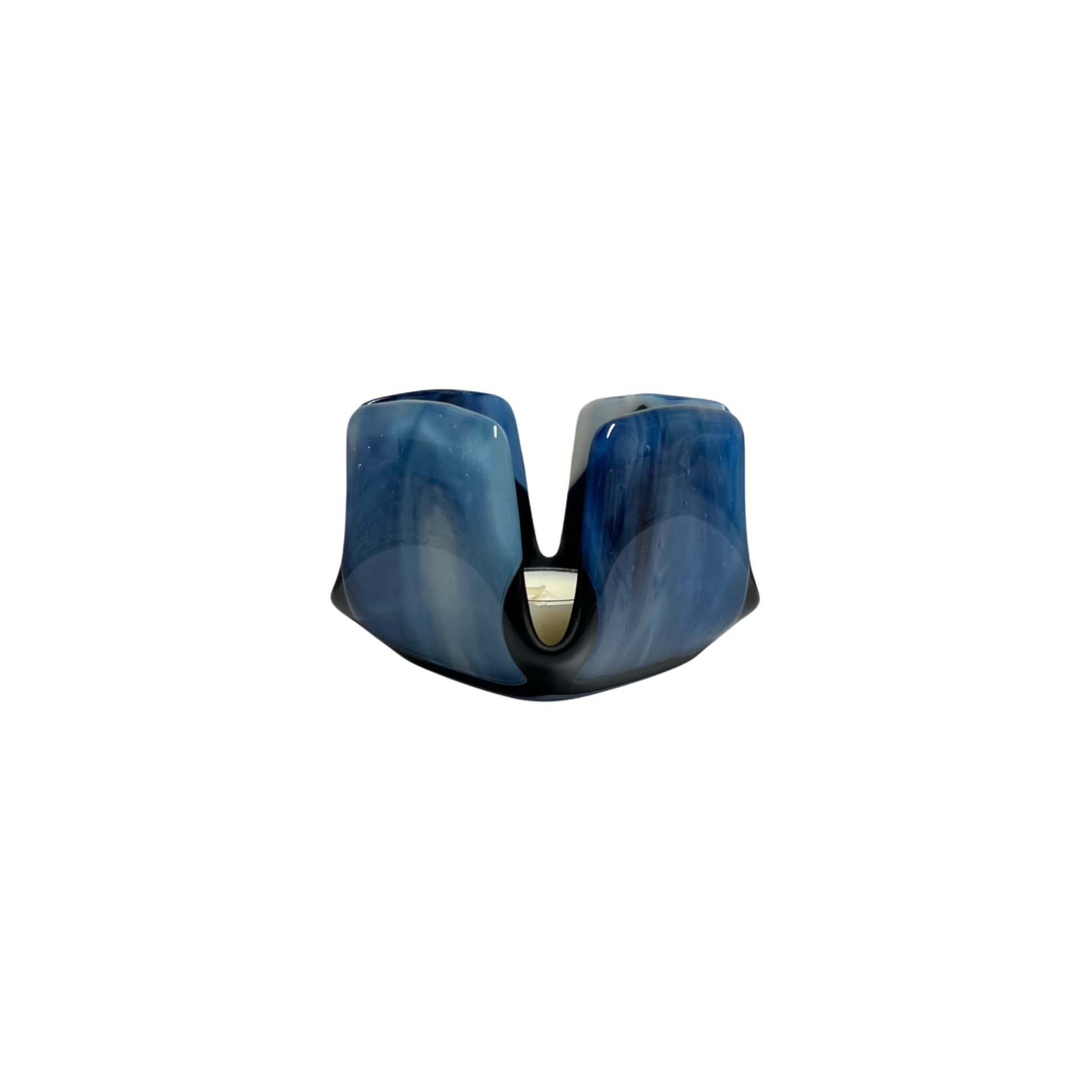 Our exclusive candleholder adorned with beautiful midnight blue, turquoise and white opalescent glass. This exquisite piece of home decor is sure to captivate with its distinct and eye-catching design.