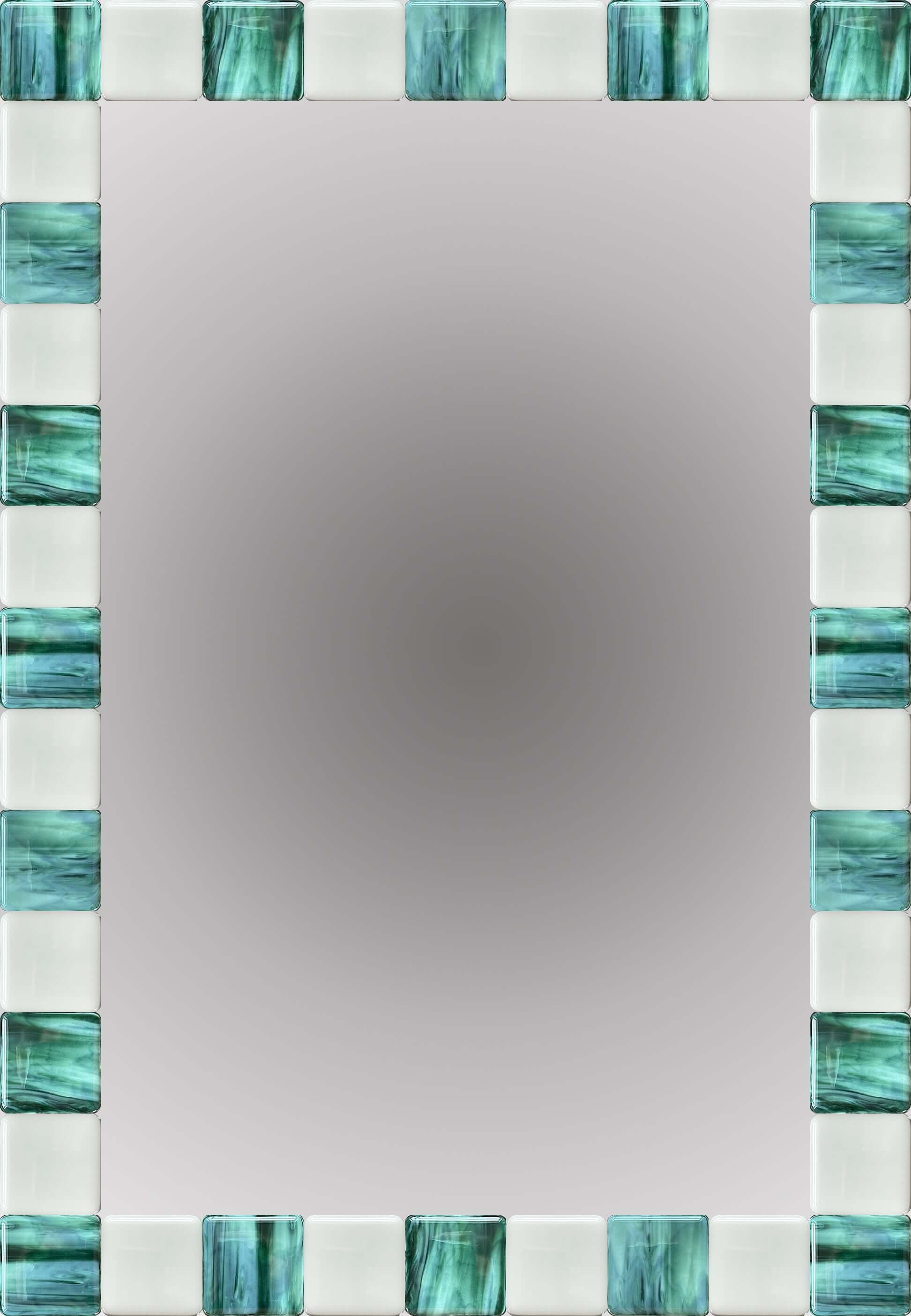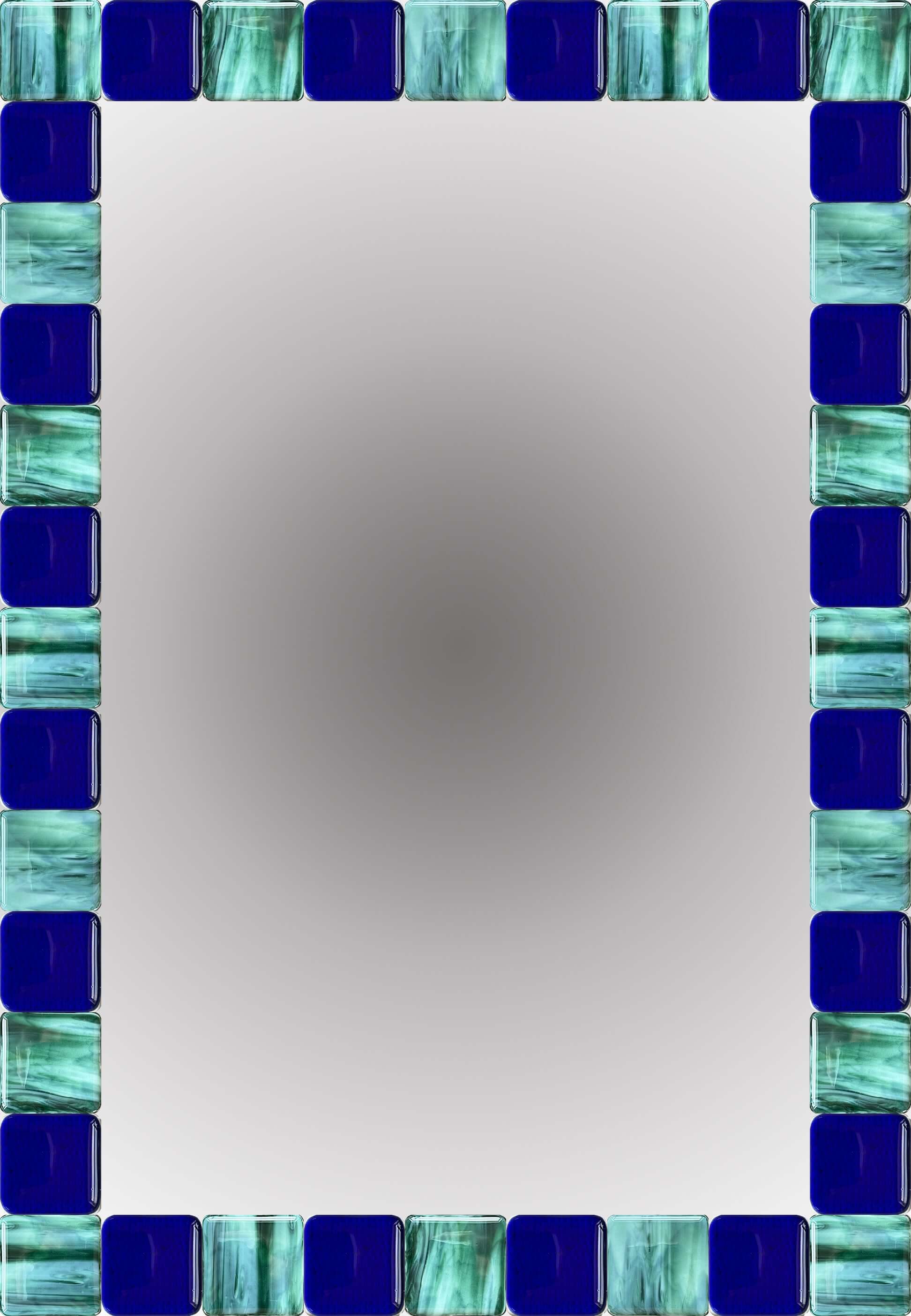 This unique mirror features a 3-inch border of kiln-formed stained glass tiles. Each square of forest green streaky or Caribbean blue streaky alternates with solid white opalescent or deep royal blue. The kiln-forming process creates squares with rounded corners and edges, which are then set over the mirror to create an eye-catching effect. Edge of the mirror is framed with a 1/8th" x 1" metal trim, finished in white or matte black.
