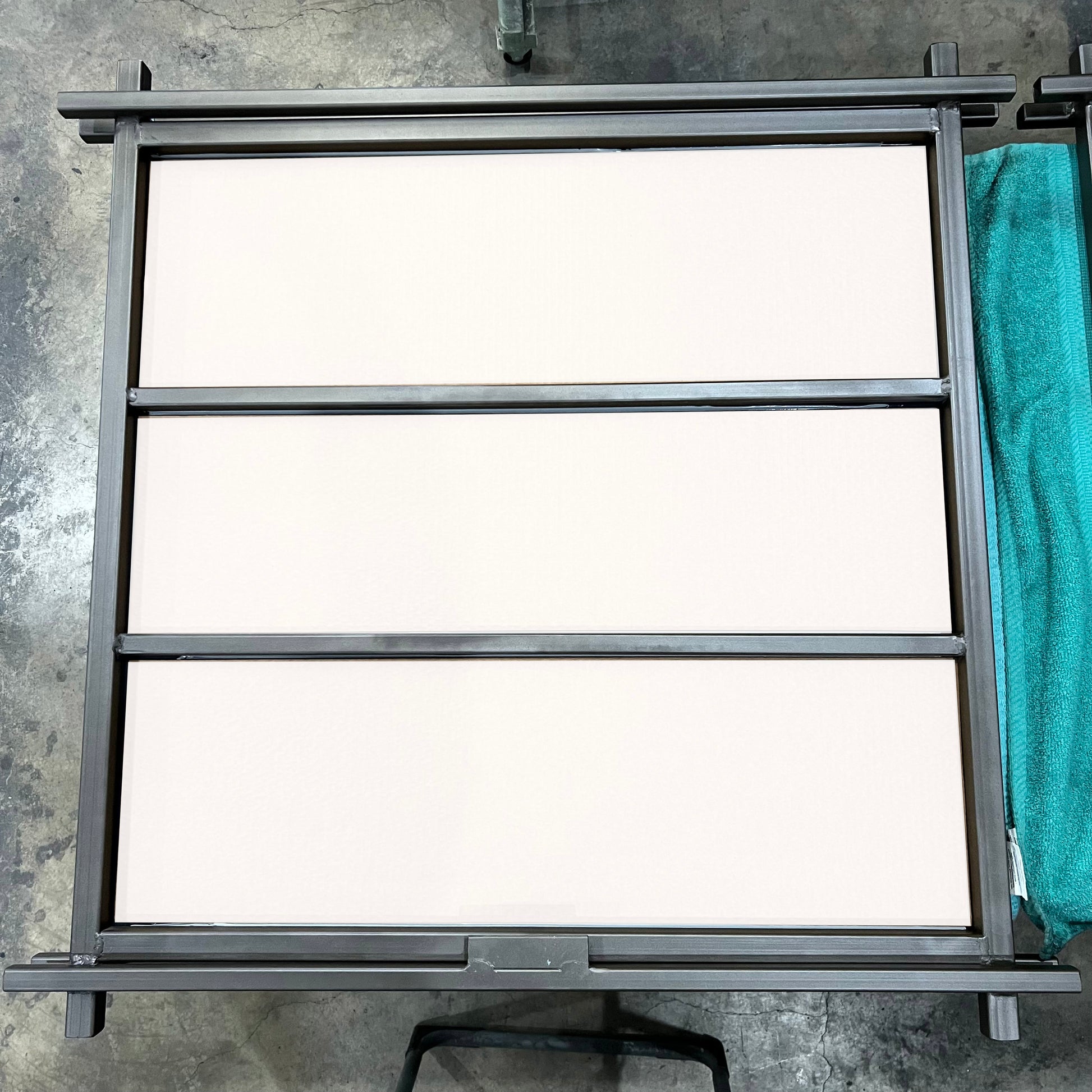 All finishes are powder coated for durability and longevity. Each frame is fabricated from square metal tubing and sealed with capped ends(reference photo) for water resistance. Mirror is backed with a rigid, moisture-resistant vinyl panel to protect the silvering and ensure long-lasting stability.