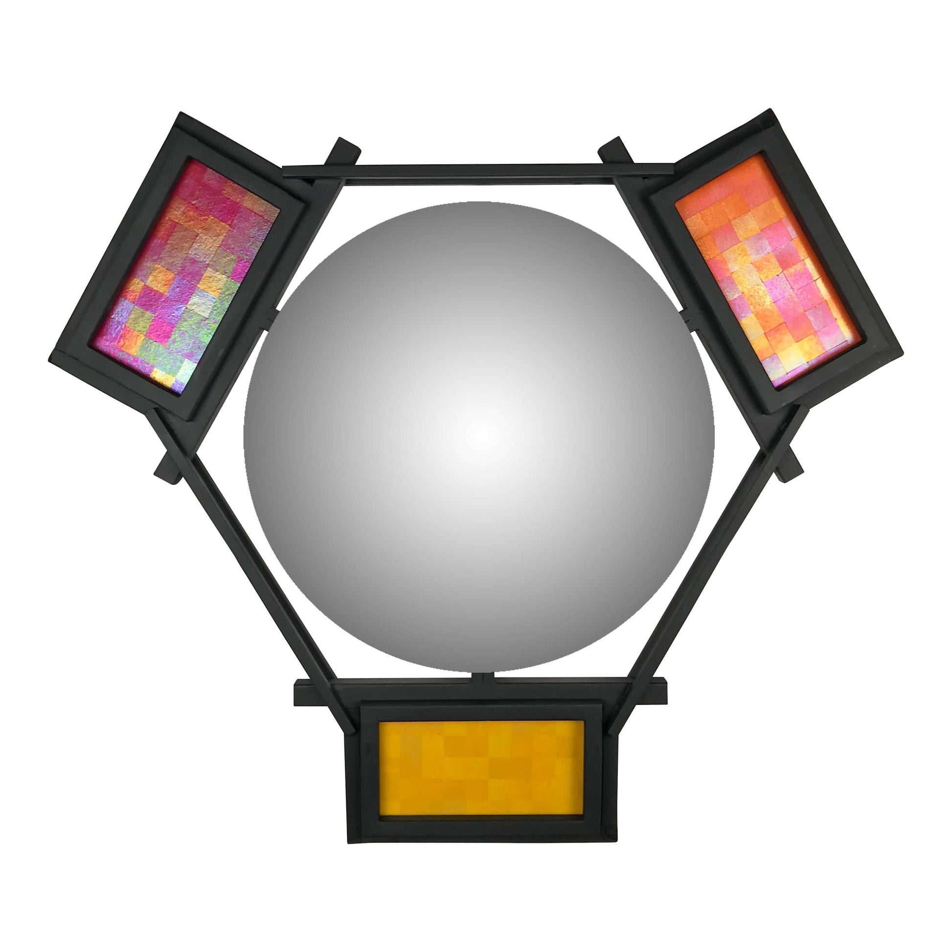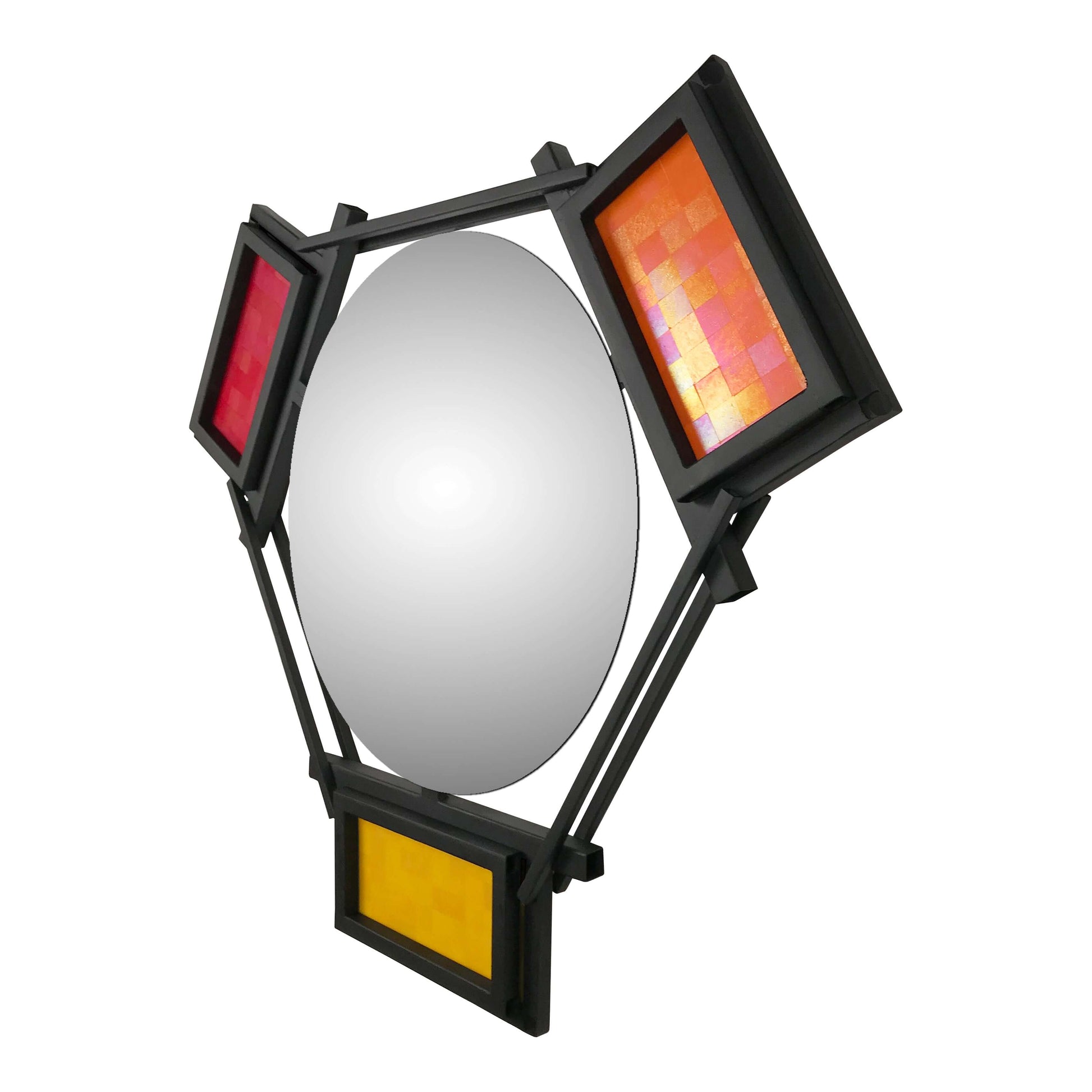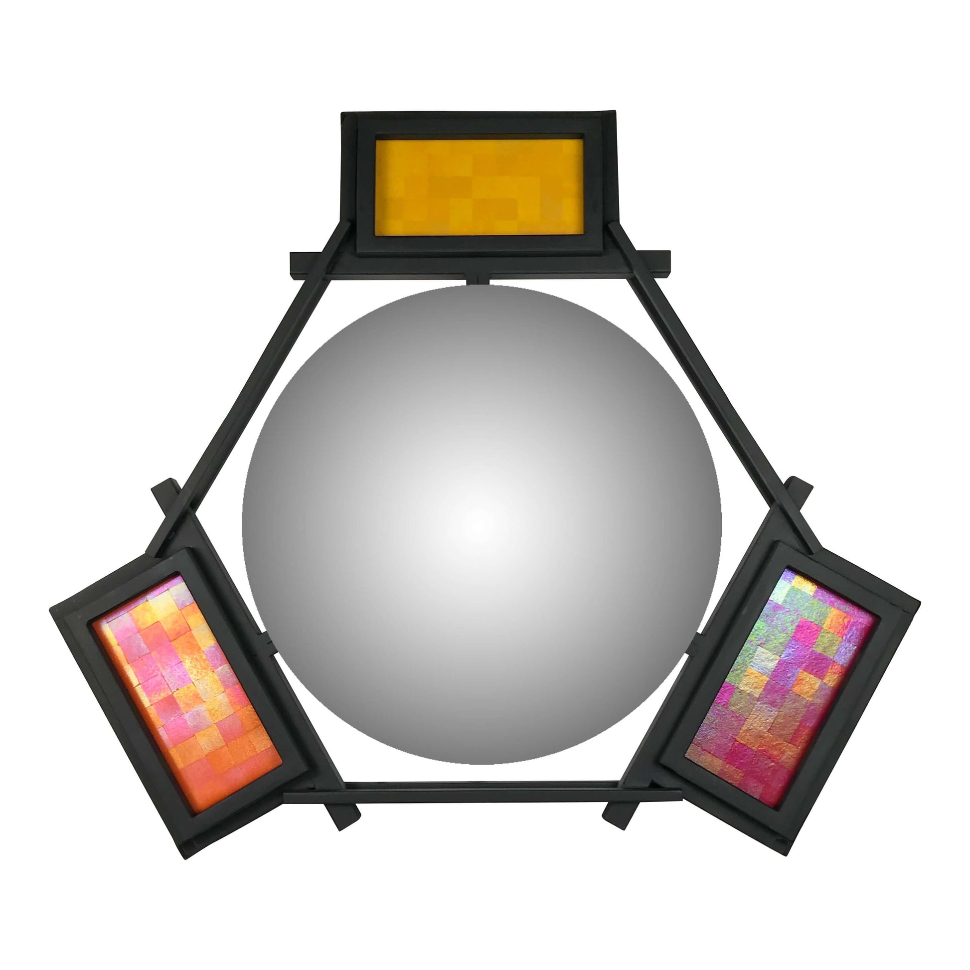 This unique home accent piece features a mirror that "floats" within a matte black metal frame. Glass colors placed in a mosaic pattern consist of tangerine orange, sunflower yellow and red. You have the choice of two hanging orientations. This mirror makes a fantastic addition to any home.