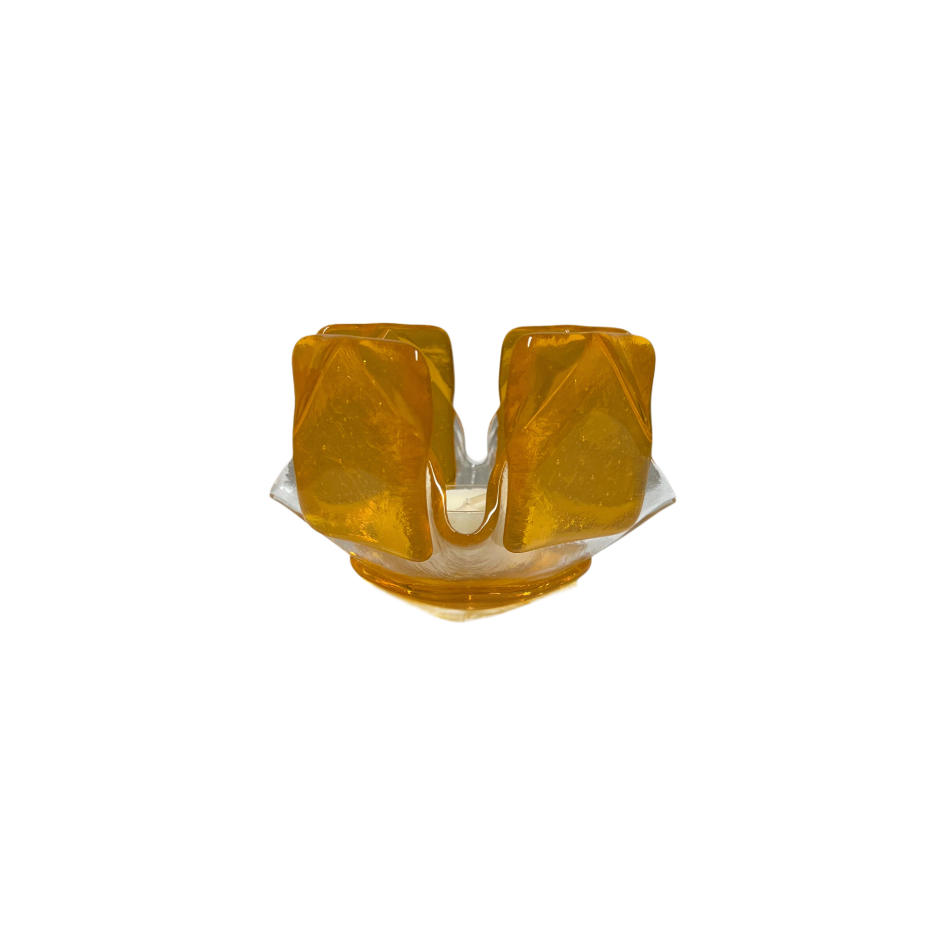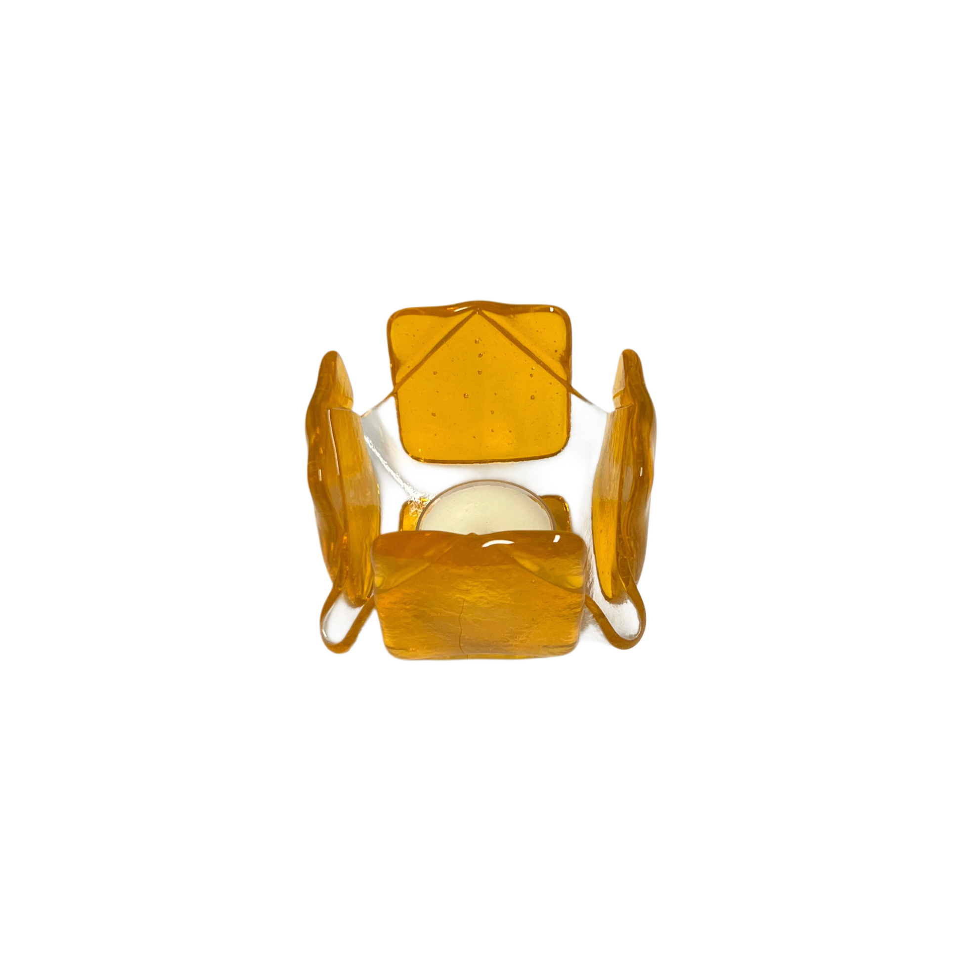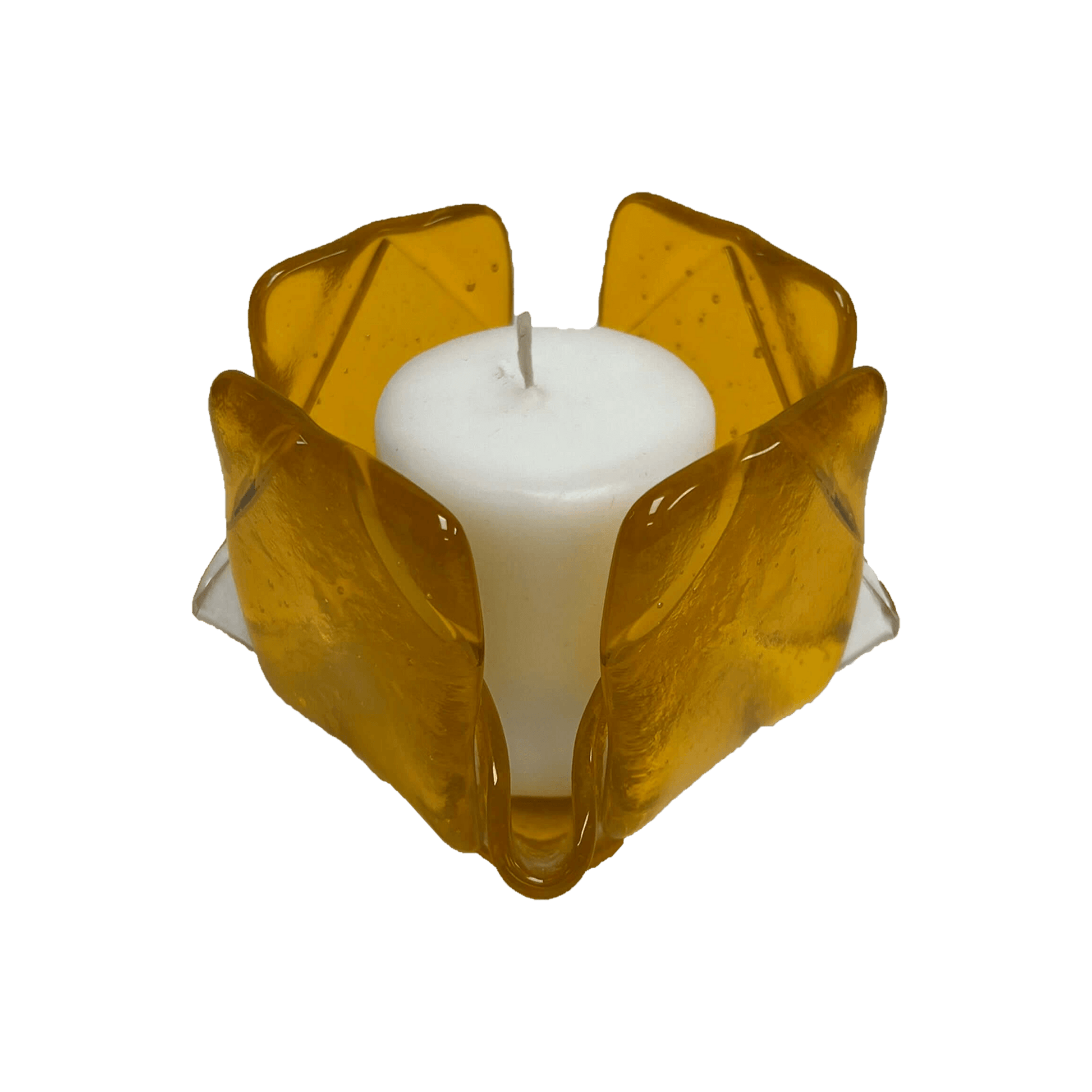 Our exclusive candleholder adorned with beautiful transparent marigold yellow glass. This exquisite piece of home decor is sure to captivate with its distinct and eye-catching design.