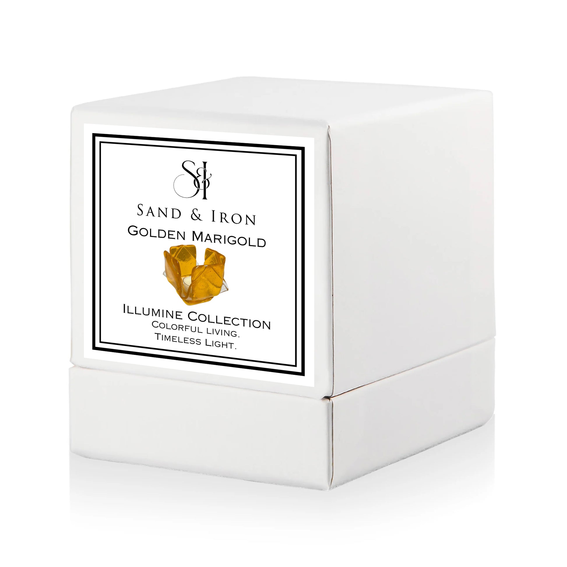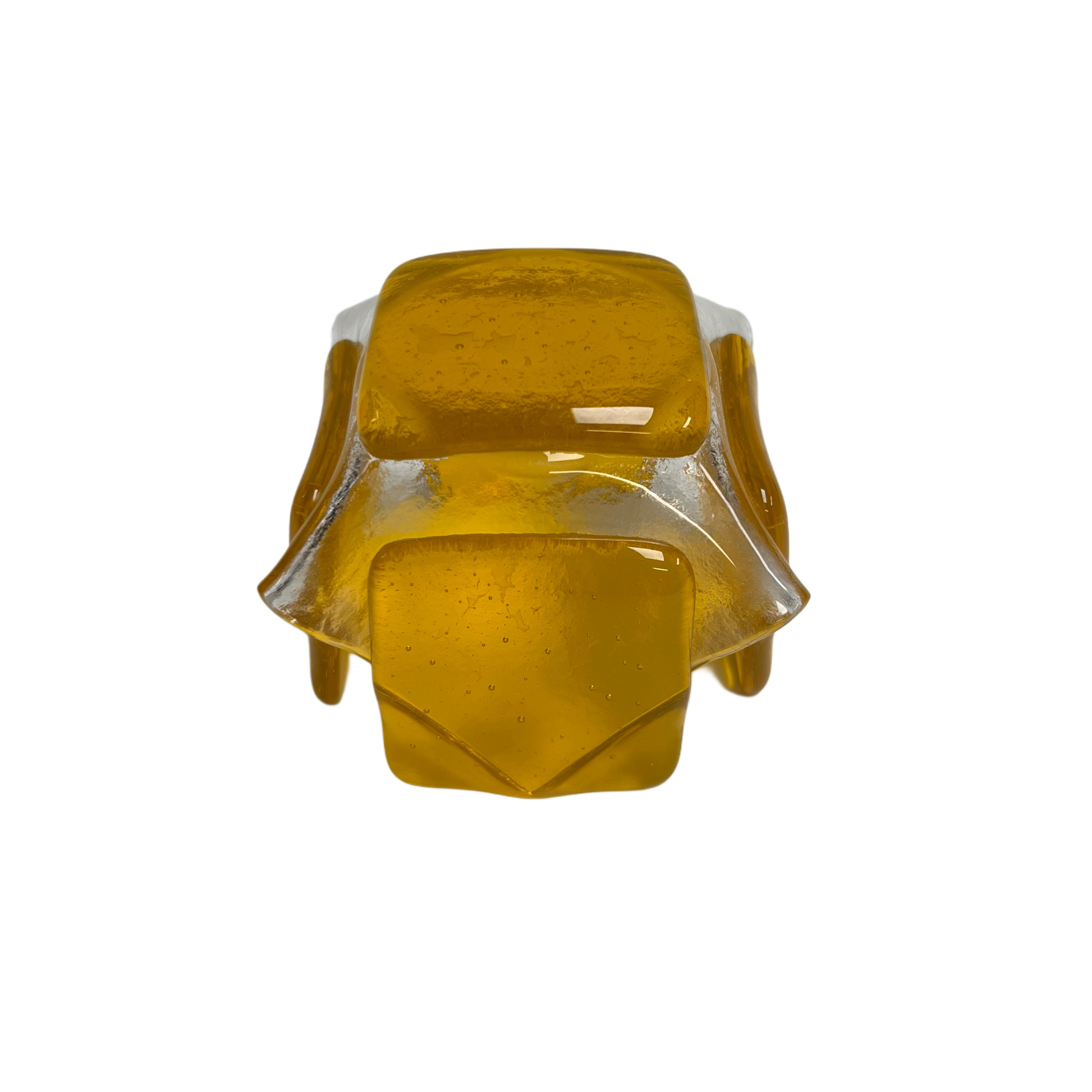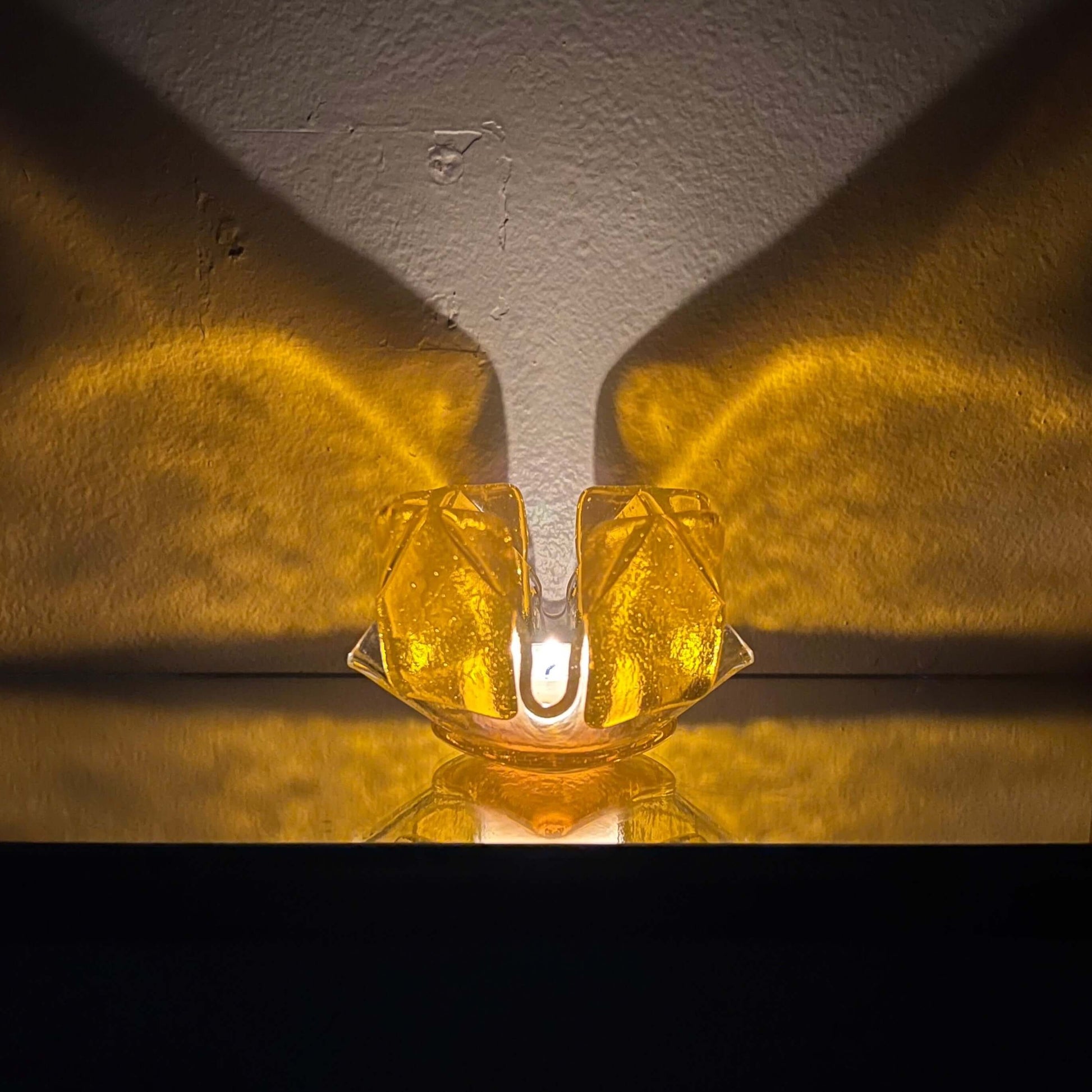 Our exclusive candleholder adorned with beautiful transparent marigold yellow glass. This exquisite piece of home decor is sure to captivate with its distinct and eye-catching design.