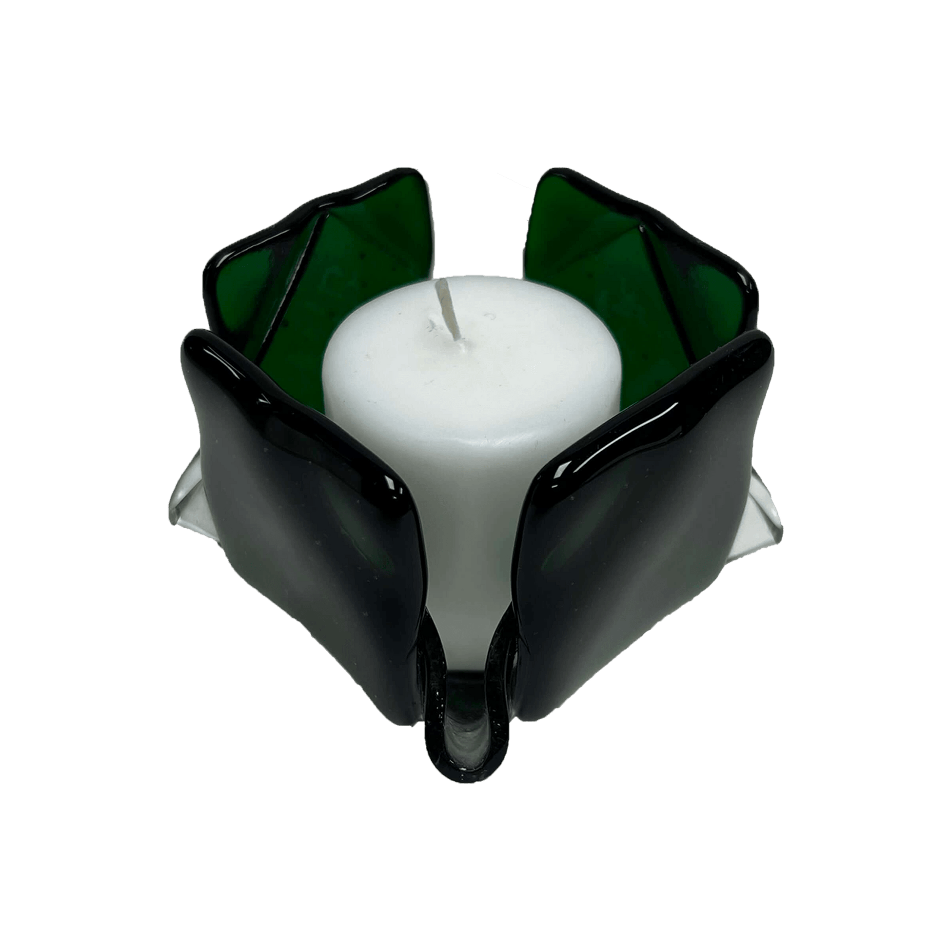 Our exclusive candleholder adorned with beautiful transparent green glass. This exquisite piece of home decor is sure to captivate with its distinct and eye-catching design.