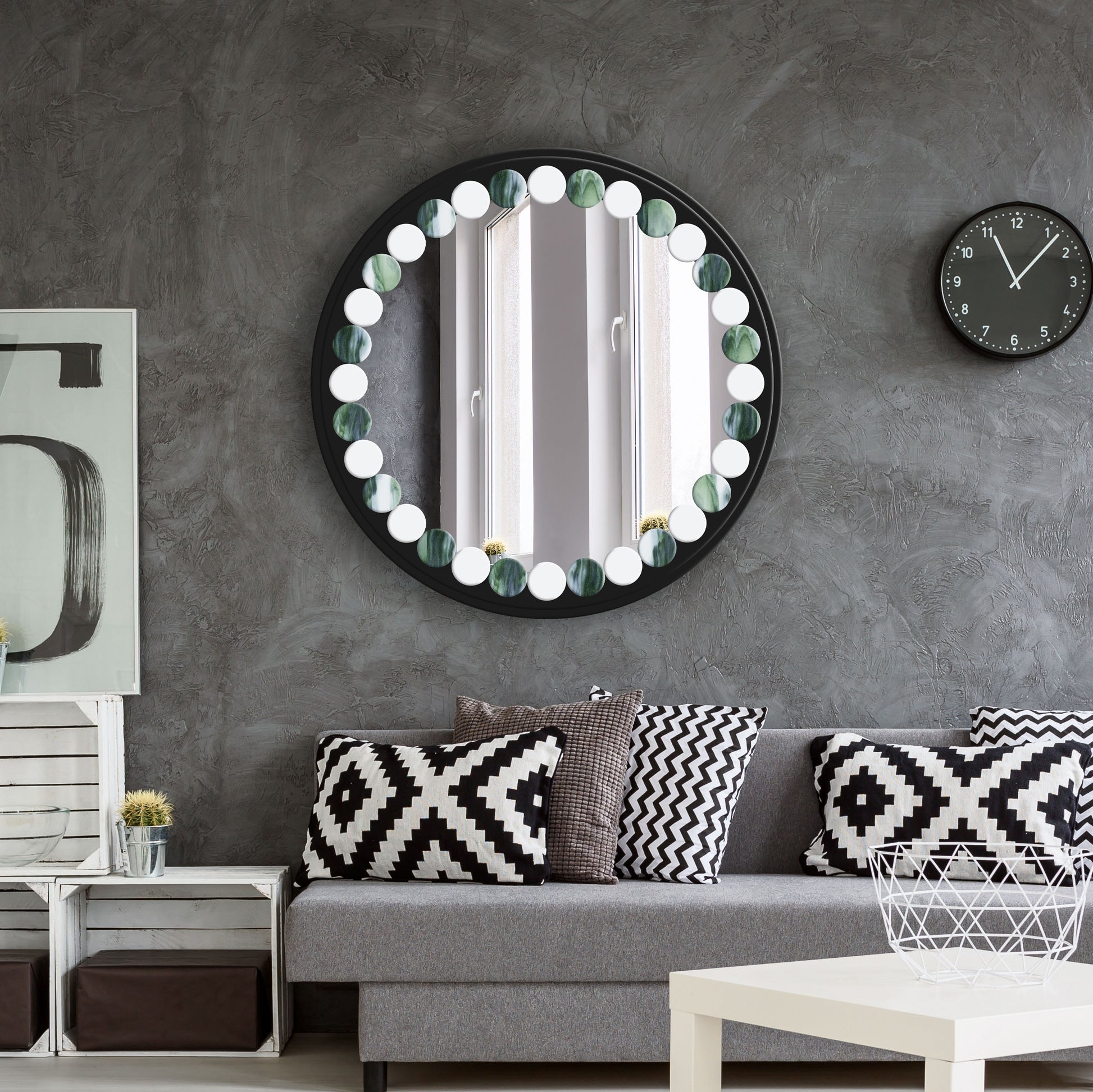 This distinctive mirror features a 3" border of kiln-formed stained glass tiles, in an alternating pattern to create a bold, geometric rhythm. The kiln-forming process gently softens the edges and corners, resulting in smooth, rounded tiles that are set over the mirror surface to add depth and visual texture. The mirror is framed by a tiered border in a sleek, satin black finish.