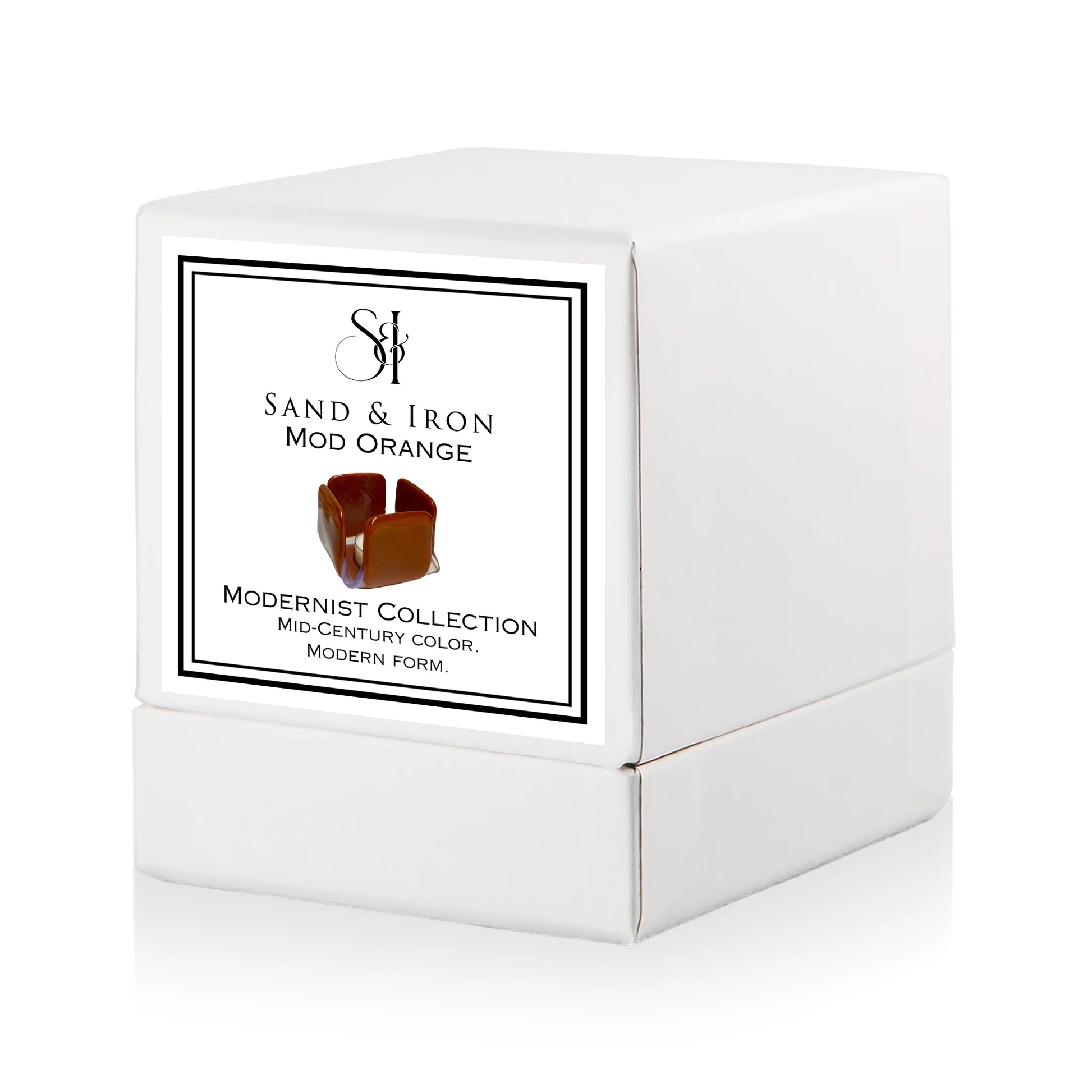 Our exclusive candleholder featuring glass in one of the timeless colors of Mid-Century Modern: Burnt Orange. These exquisite pieces of home decor are sure to captivate with their distinct and eye-catching design.