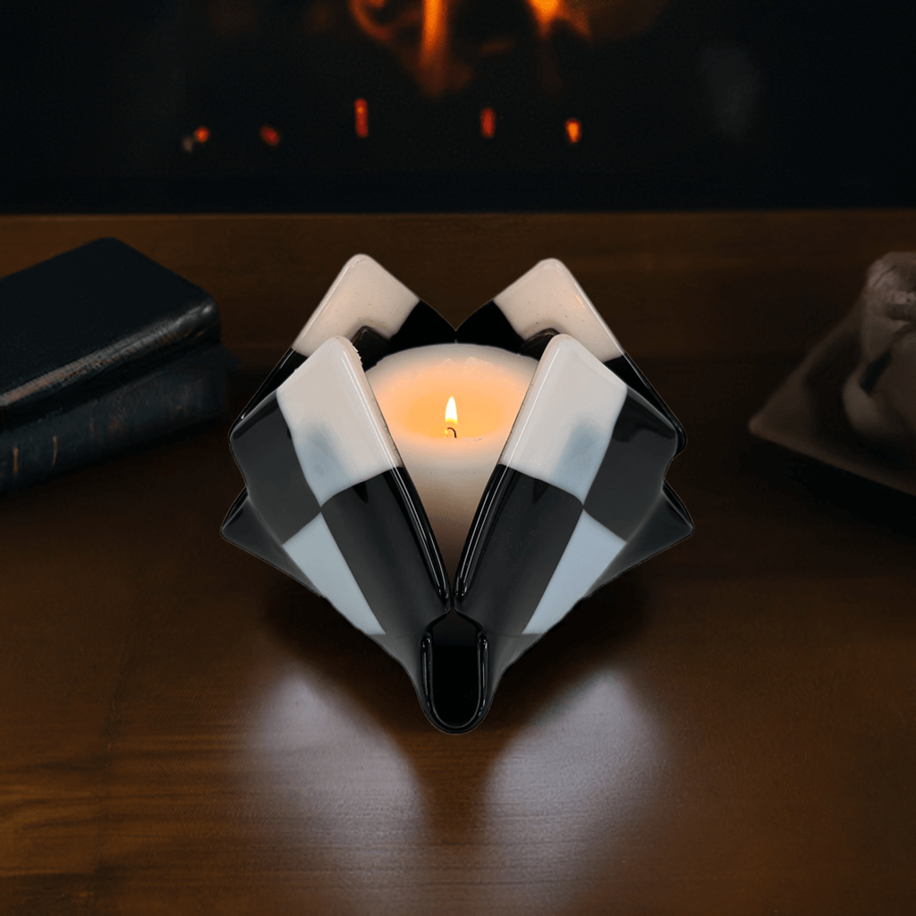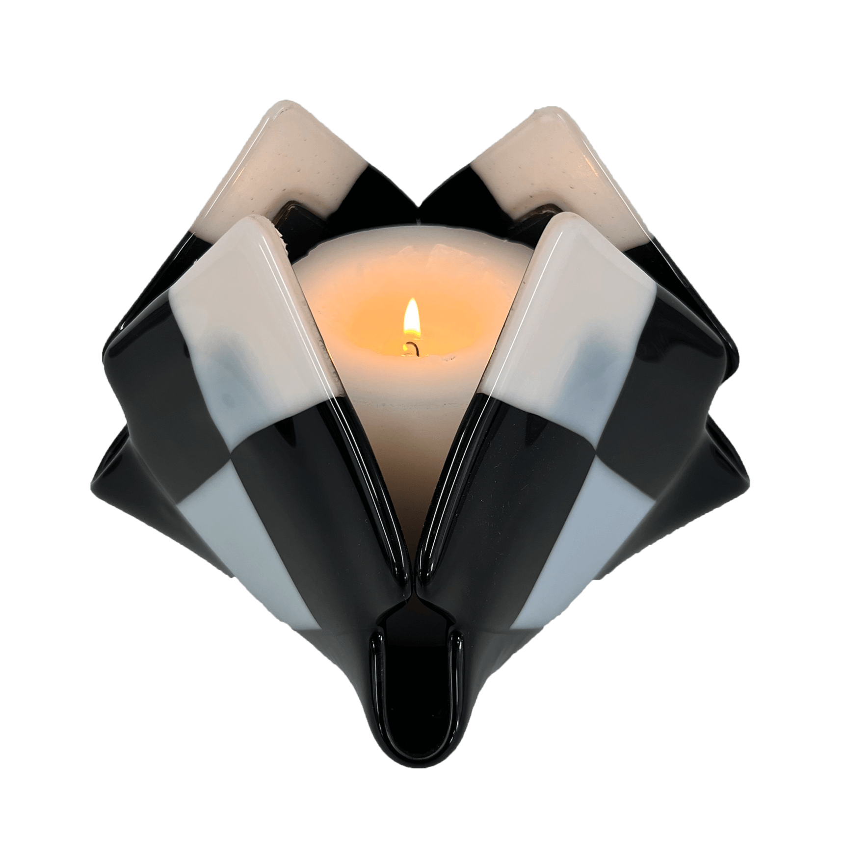 Our exclusive home accessory in a checkerboard pattern with a mix of black and white opalescent. This exquisite piece of home decor is sure to captivate with its distinct and eye-catching design.