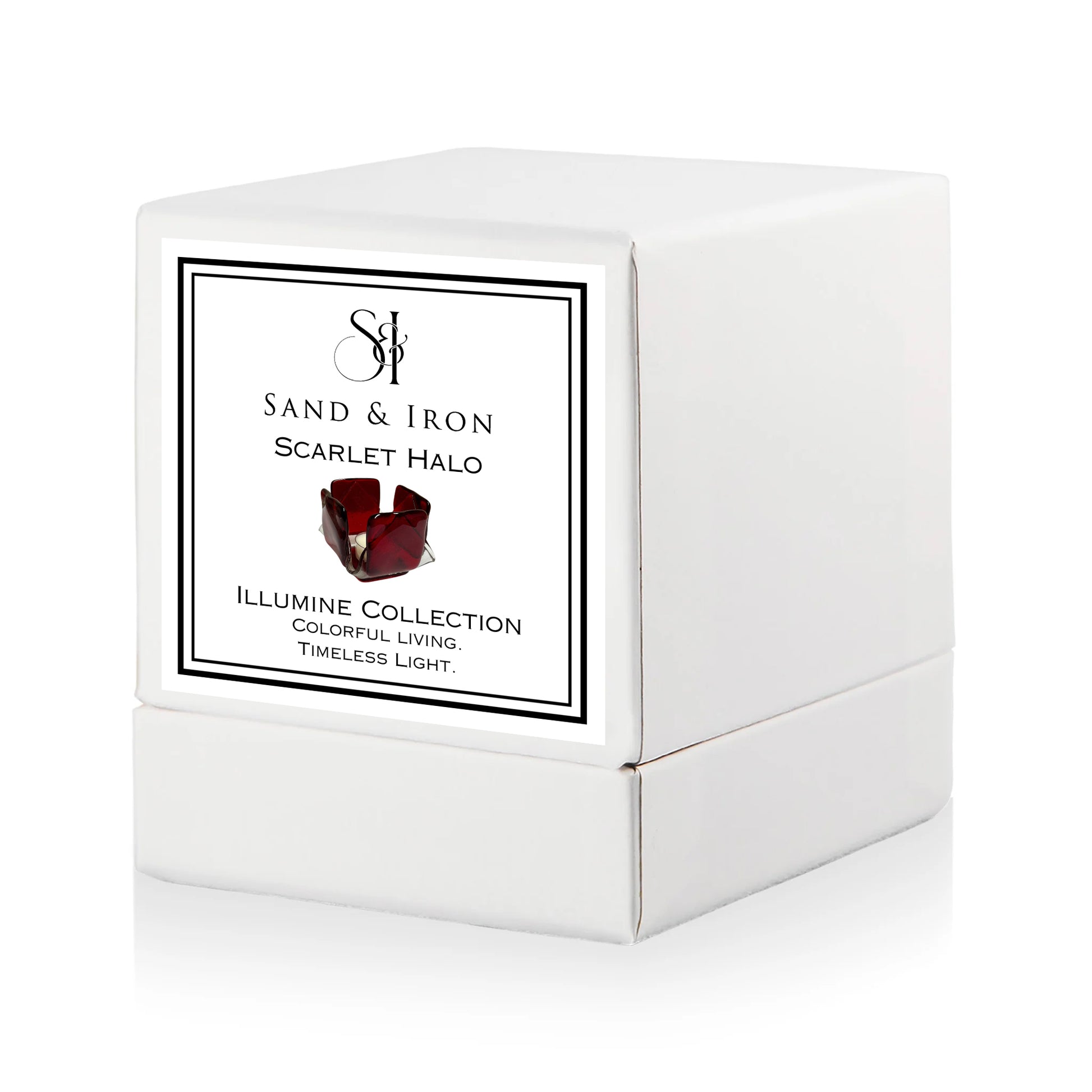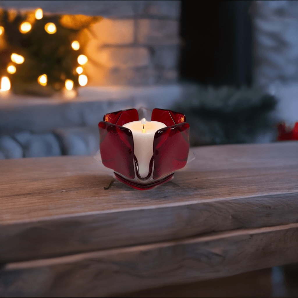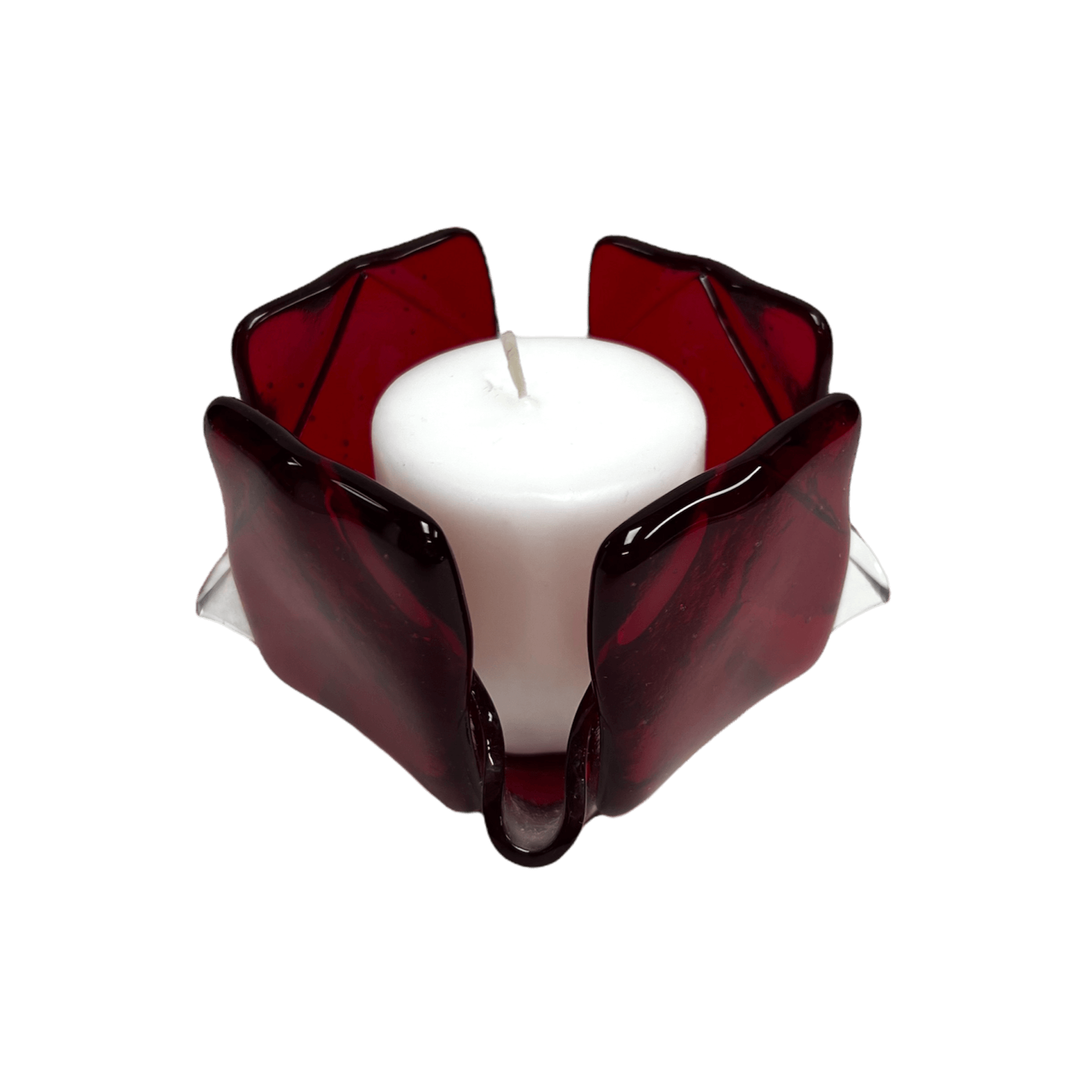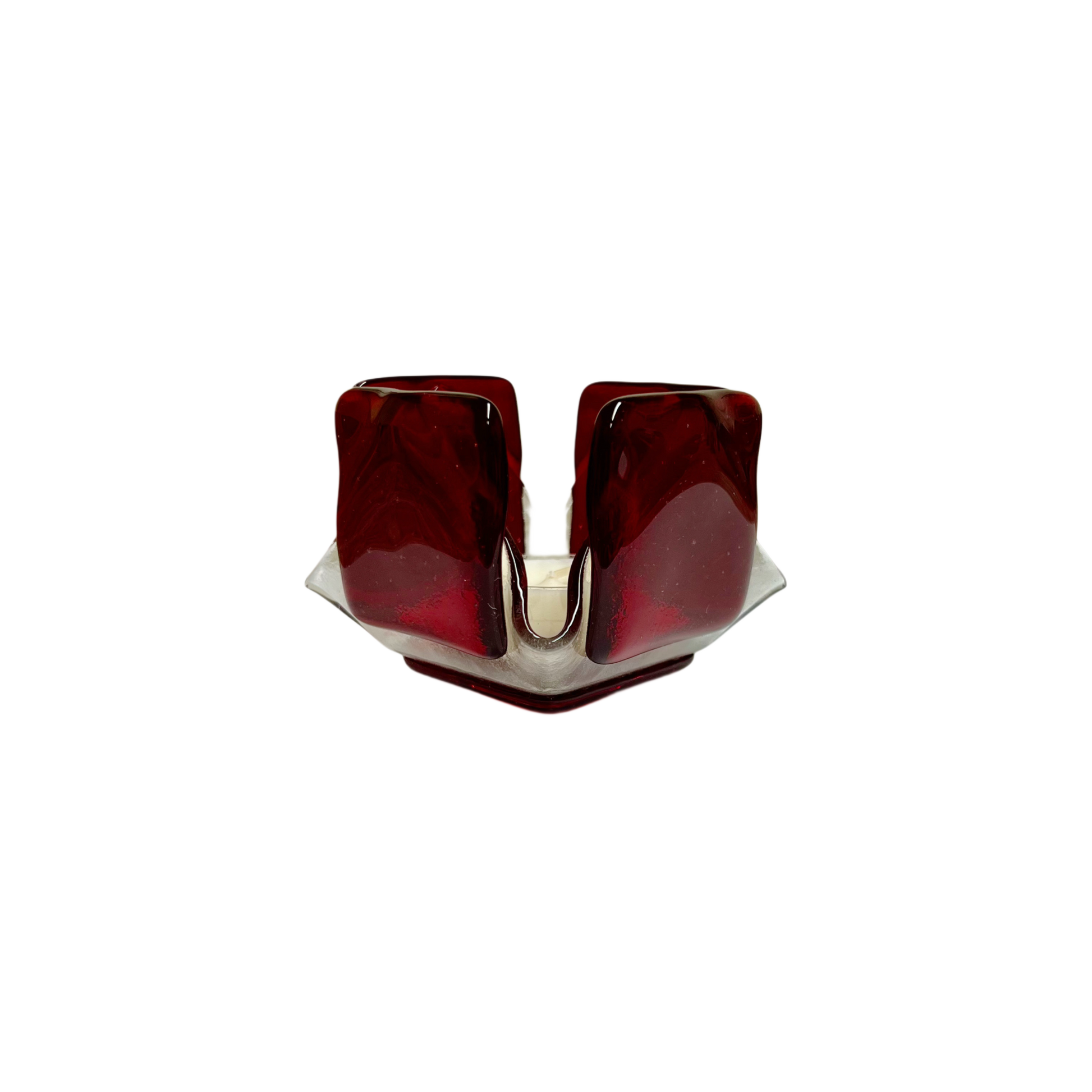 Our exclusive candleholder adorned with beautiful transparent red glass. This exquisite piece of home decor is sure to captivate with its distinct and eye-catching design.