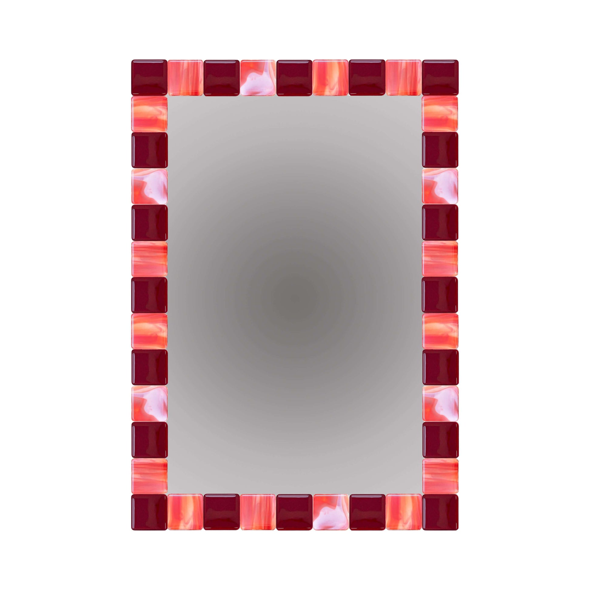 This unique mirror features a 3" border of kiln-formed stained glass squares. Each square of red and white streaky alternates with white opalescent or transparent red. The kiln-forming process creates squares with rounded corners and edges, which are then set over the mirror to create an eye-catching effect. Mirror is framed with a 1" x 1" metal trim, finished in either white or matte black.
