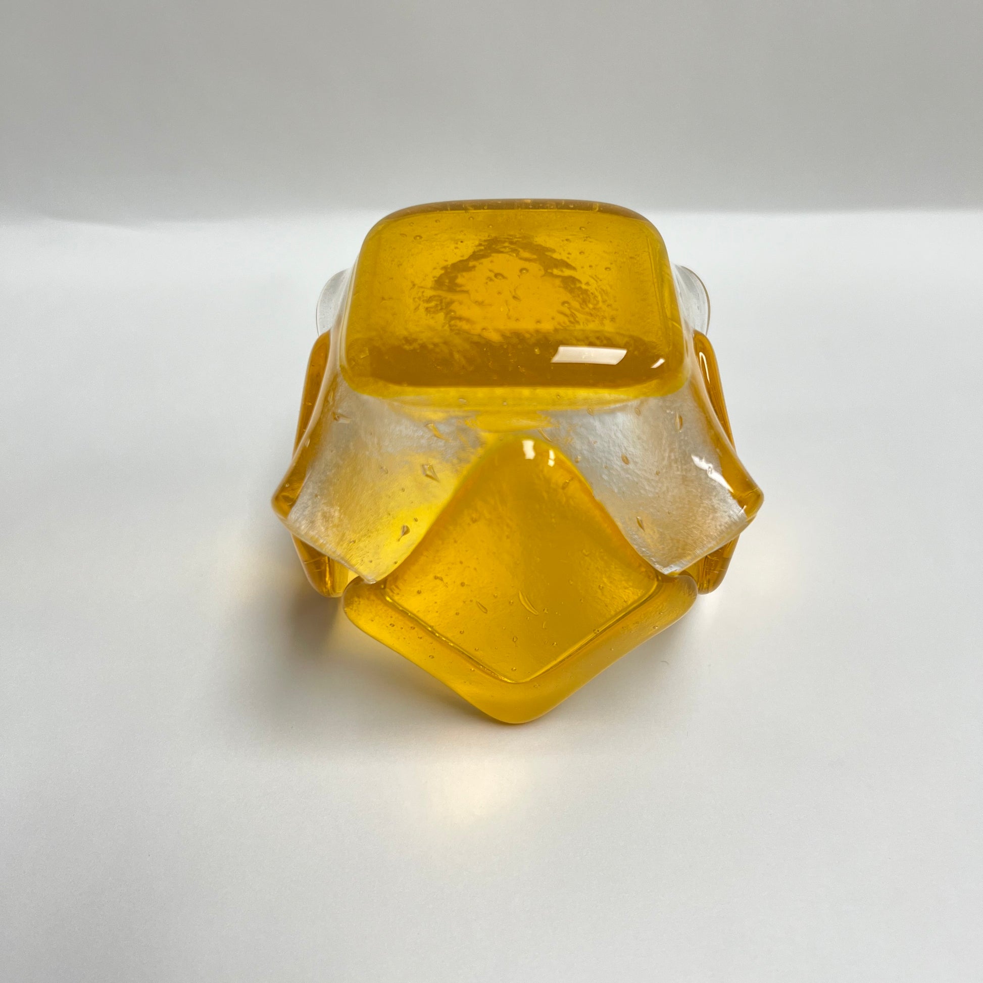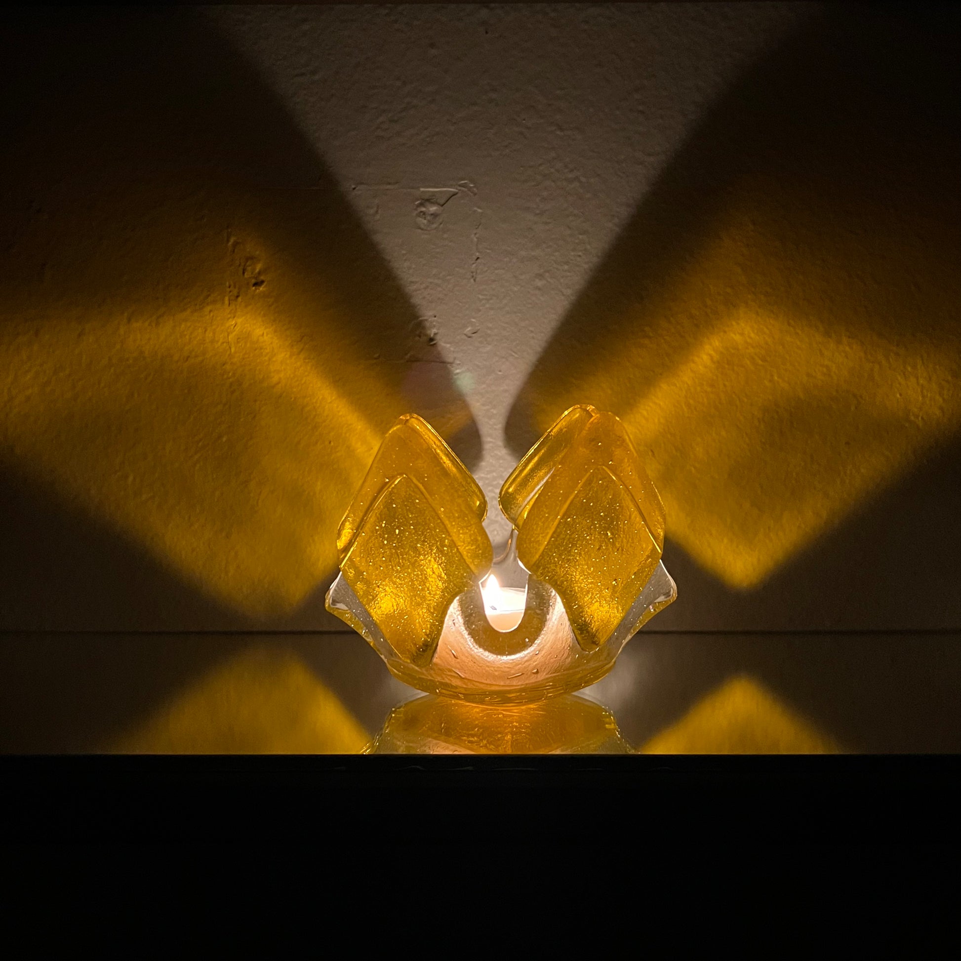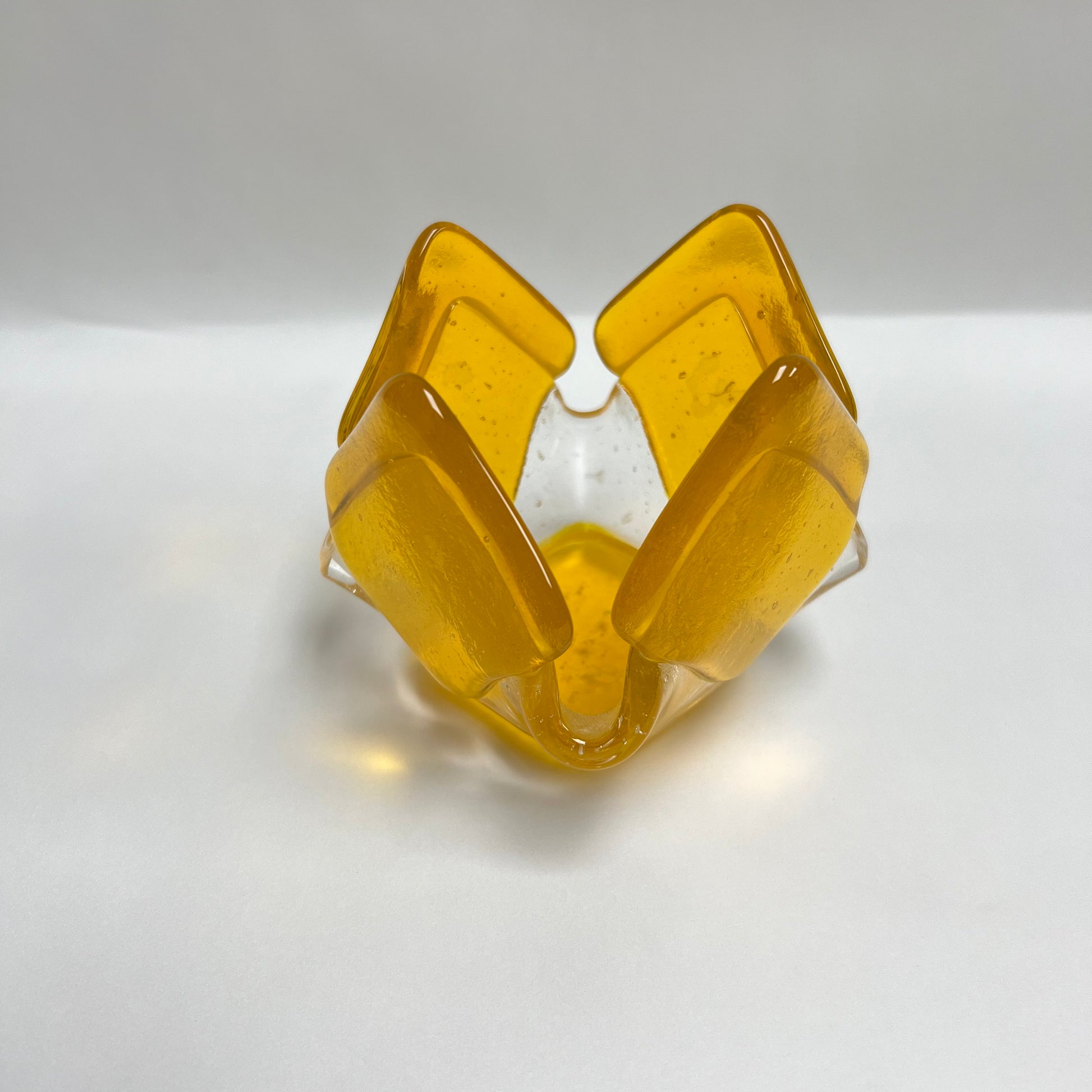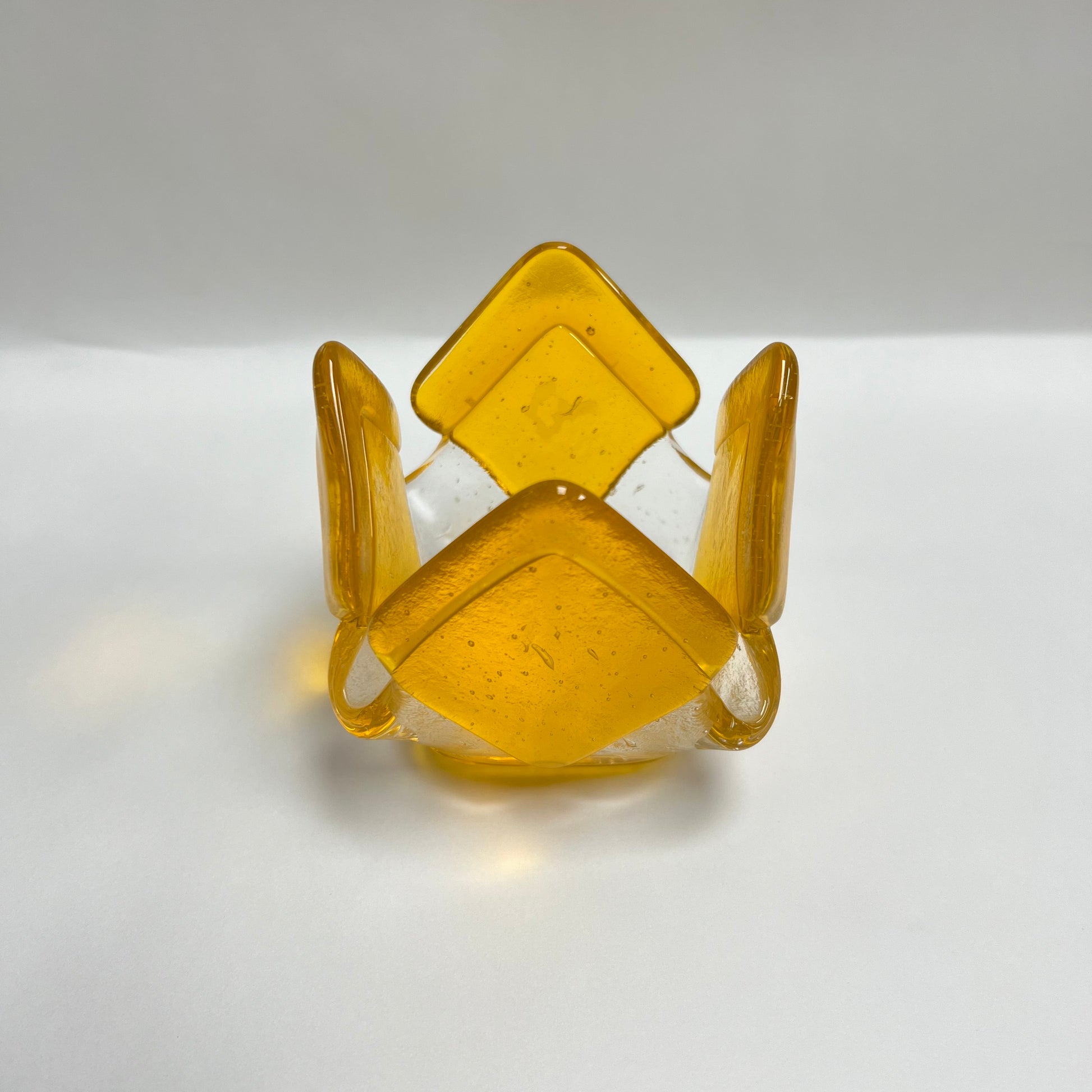 Our exclusive candleholder adorned with beautiful transparent marigold yellow glass. This exquisite piece of home decor is sure to captivate with its distinct and eye-catching design.