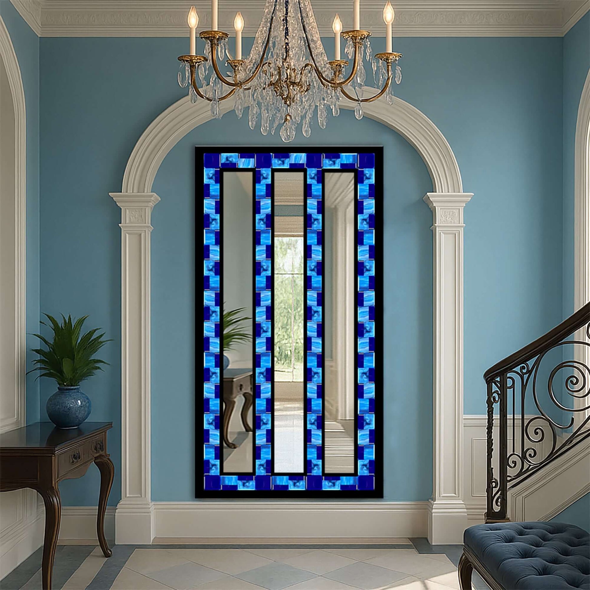 A bold study in rhythm, light, and materiality, this vertical mirror is framed in a distinctive triple-panel design that creates a powerful architectural presence on the wall. Each column features kiln-formed glass tiles, alternating in a woven-like pattern. The result is a richly dimensional border that captures and refracts ambient light while showcasing the organic swirls and depth of the glass itself.
