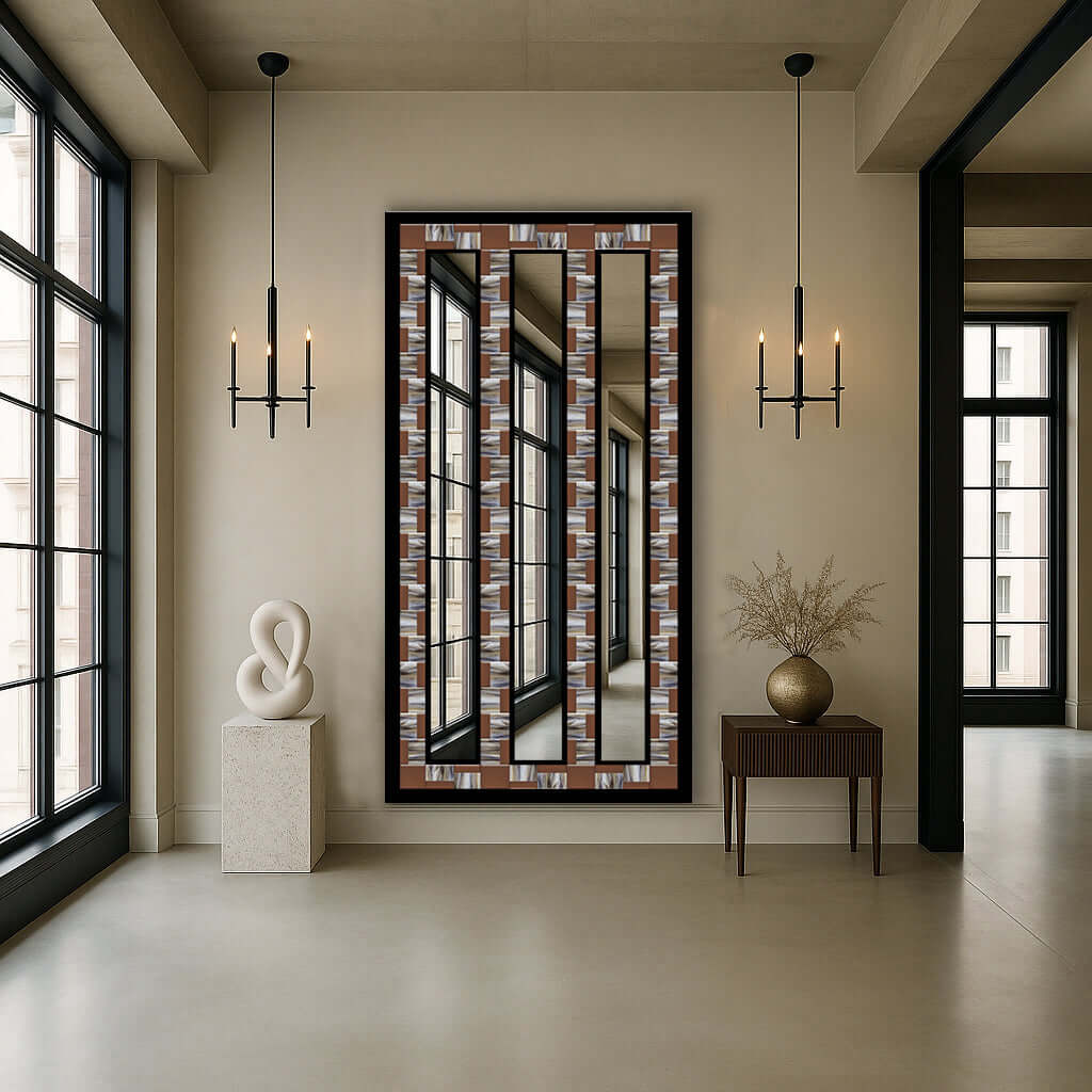 At over seven feet tall, this mirror transforms any space—whether a loft entryway or modern gallery wall—into a focal point of elegant geometry. The mirror's three narrow panes are inset into the handcrafted frame to accentuate height and echo the verticality of architectural columns. Bordered by a two-inch metal frame, the entire piece is grounded by its substantial, sculptural edge, balancing intricate surface detail with strong structural clarity.