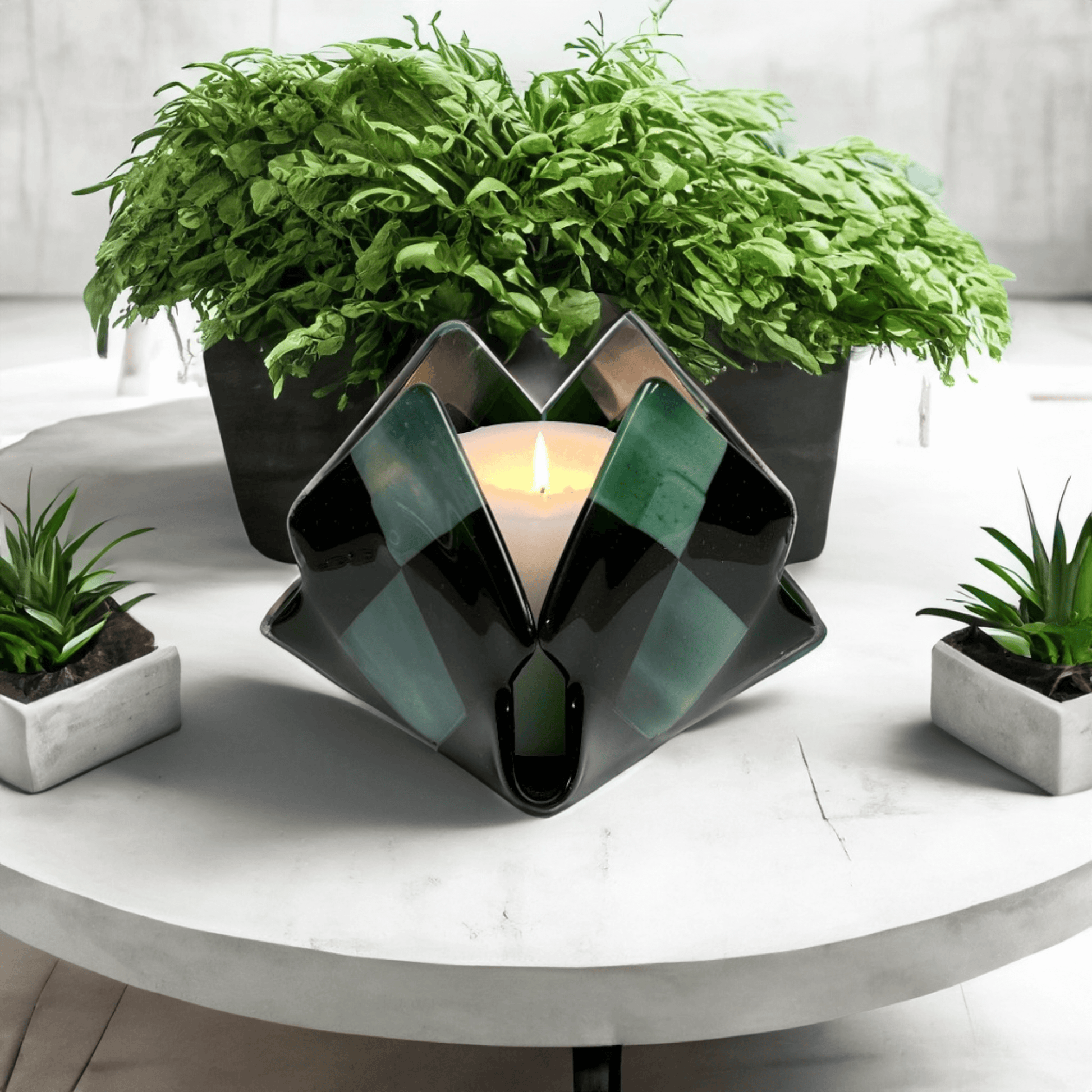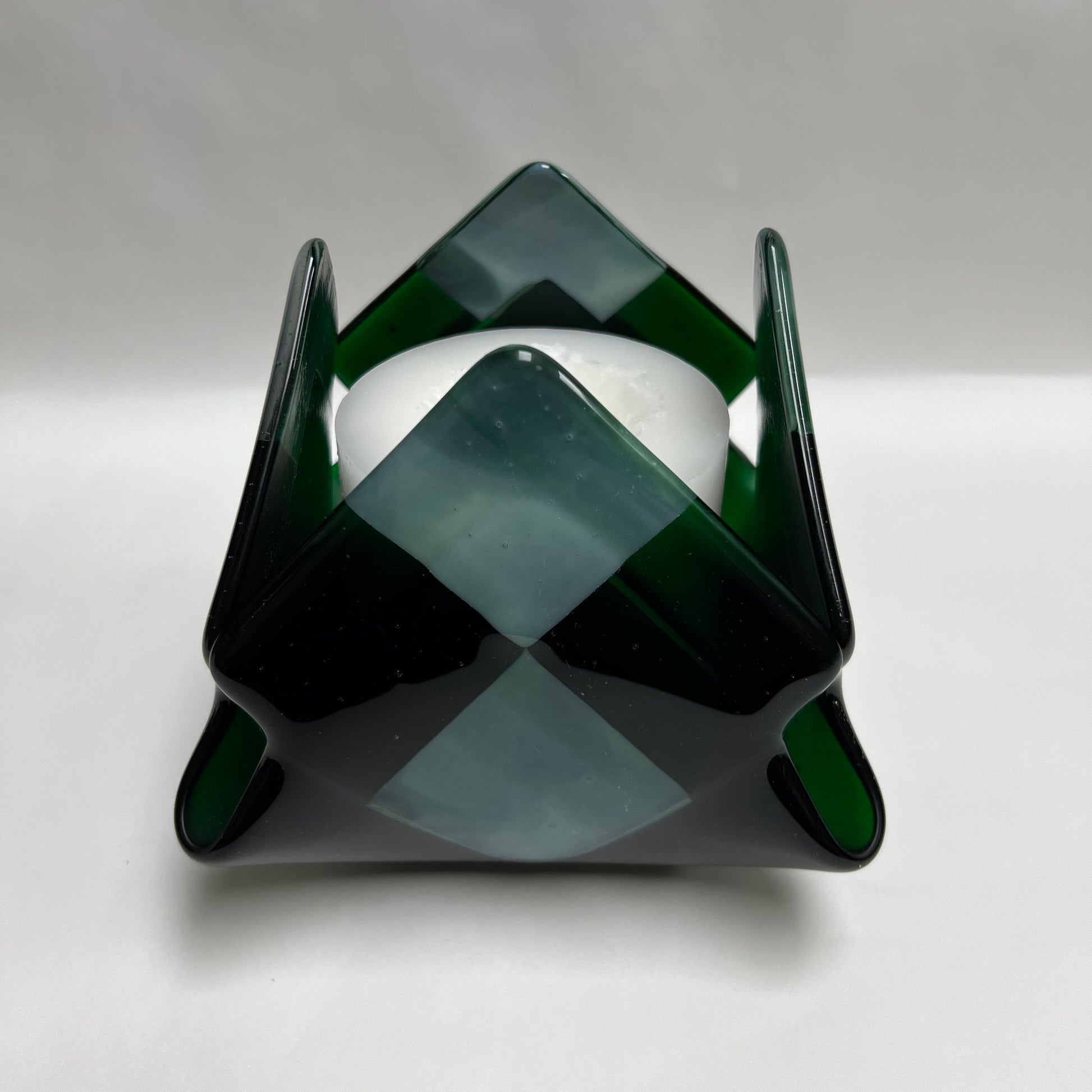 Our exclusive home accessory in a checkerboard pattern with a mix of aventurine green, kelly green and white opalescent. This exquisite piece of home decor is sure to captivate with its distinct and eye-catching design.